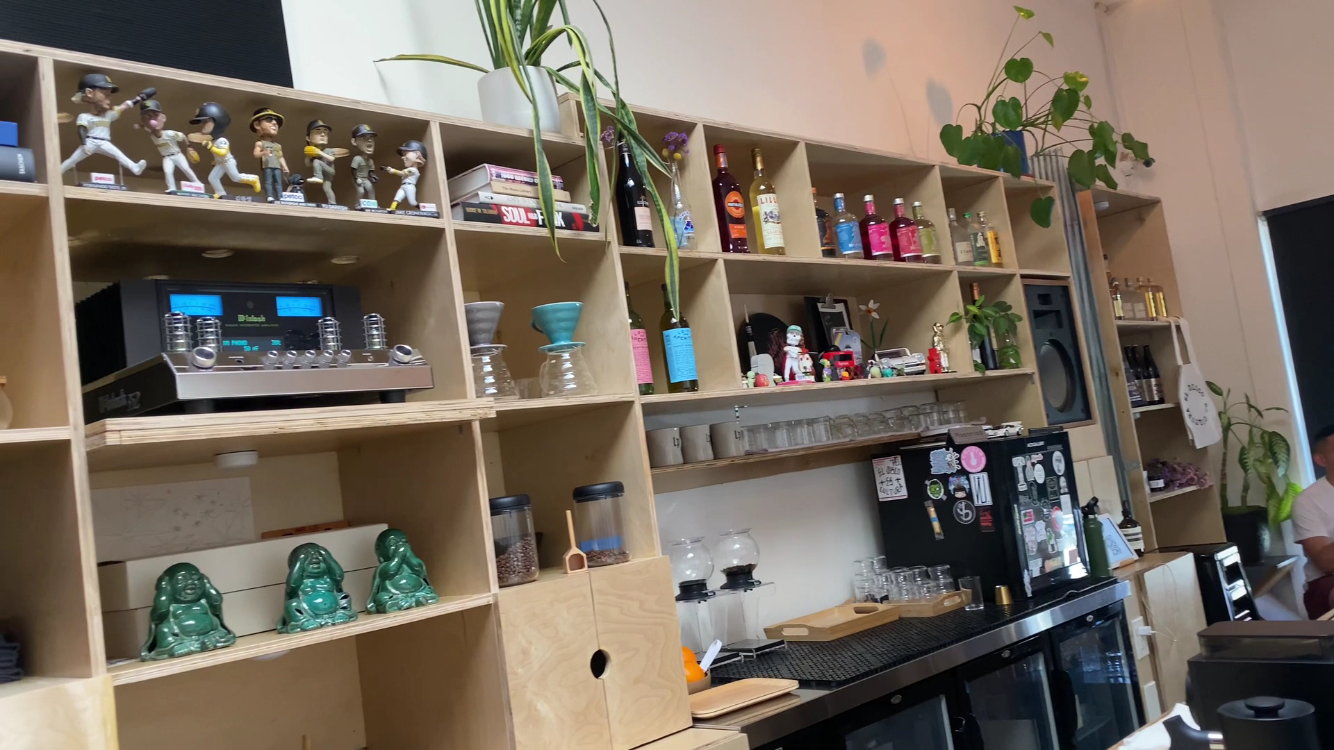 The cafe/bar has a minimalist design, inspired by shops in Tokyo, and has a lot of cool little trinkets, items, and vinyls. The menu is really nice, with a high-quality, thoughtful selection of coffee, tea, and alcoholic beverages.