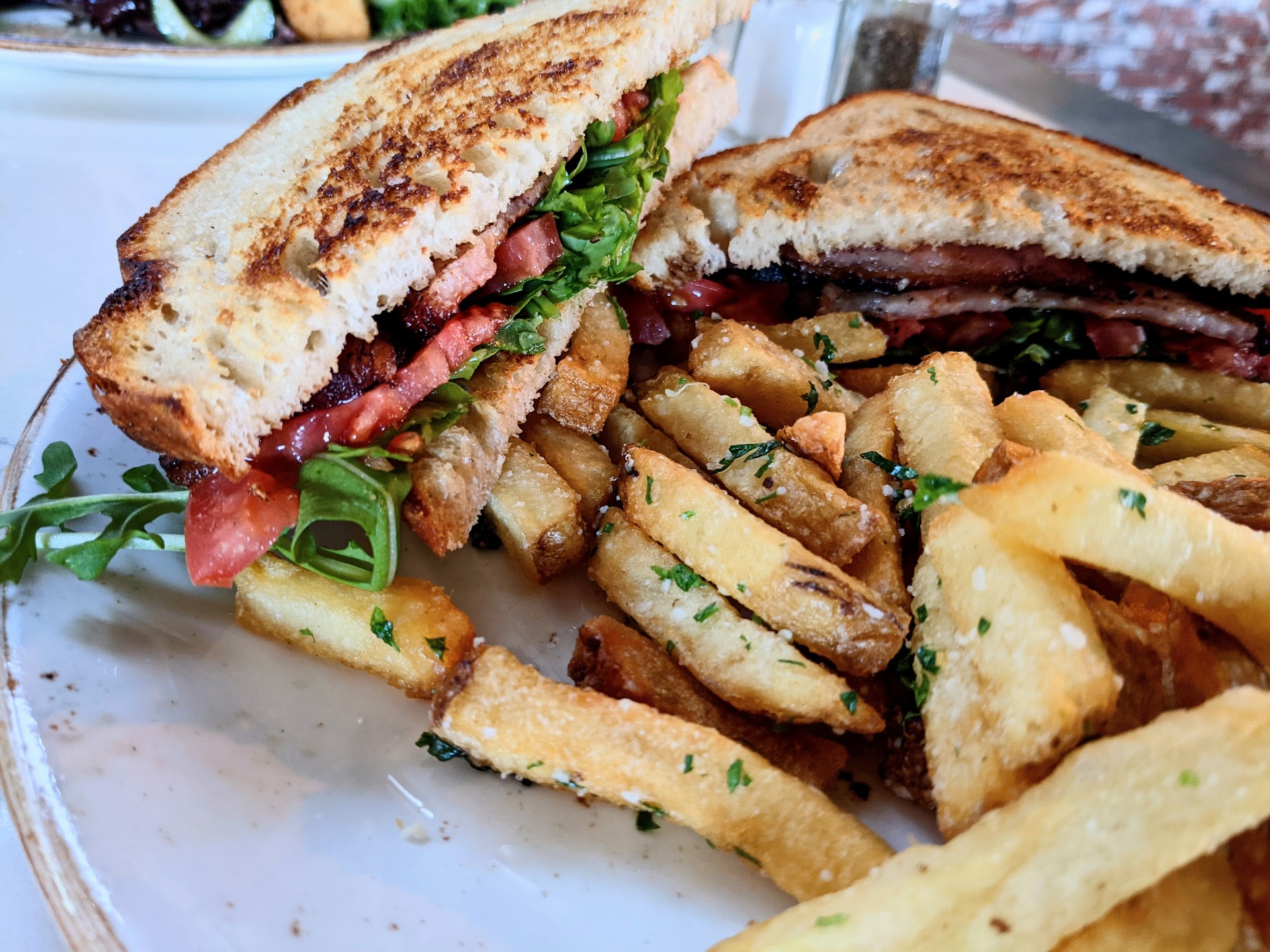 BLT - 12 dollars with about 50 cents of avocado aka a thin spread on the toast. A generous amount of bacon and overall pretty appetizing. 12 dollars for a thin spread is hard to purchase. The generous helping of bacon helps.