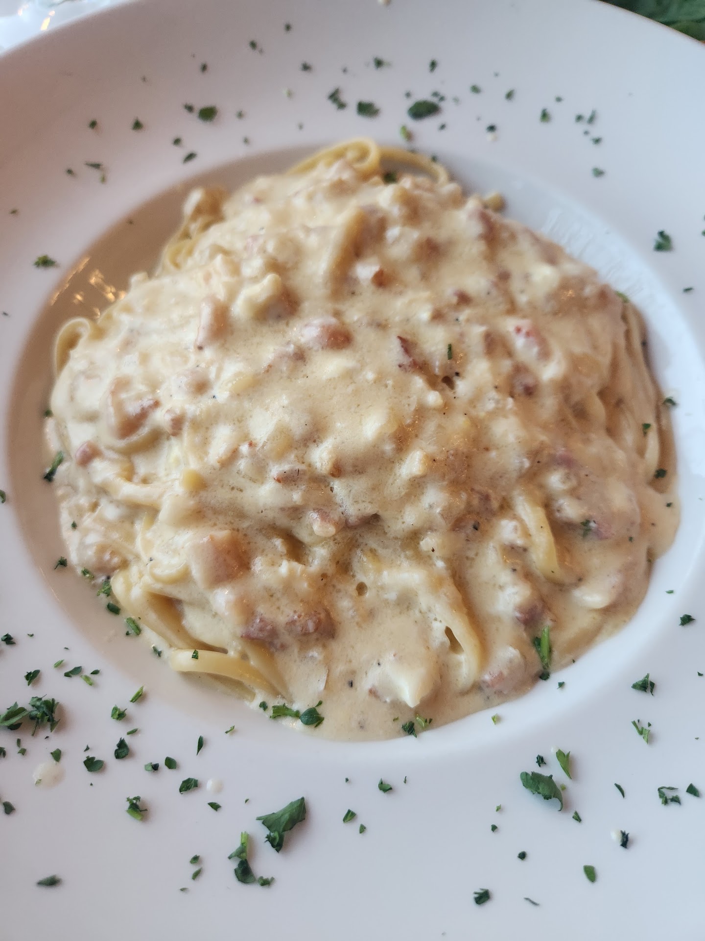 The real disappointment came with the main courses. The carbonara was a grainy, goopy mess that I wouldn’t write home about. It lacked the creamy richness that this classic dish is known for. Then, there was the shrimp and scallop fettuccine. For $30, I expected something special, but the baby bay scallops tasted frozen and far from fresh. With only three shrimp on the plate, it felt like a poor value proposition for what should be a star dish.