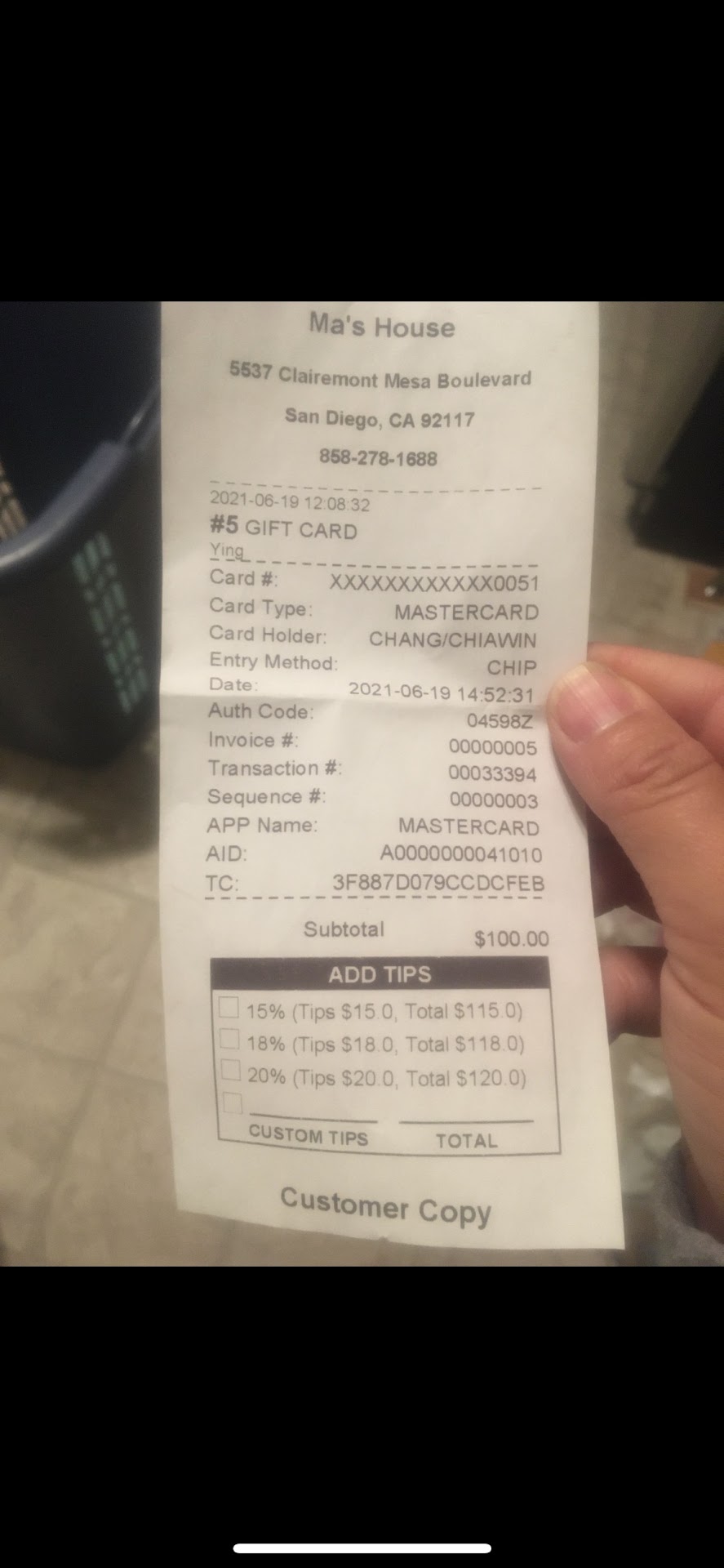 Read moreFirst of all, I don’t usually write reviews but I have to for this one! The experience was just bad. It was my first time visiting San Diego so I did a extended research to find places to eats. I saw this Ma’s House and thought why not give it a try. We went there and the person serving us was just rushing us and he seem to show favoritism. Moving on, we order and thought maybe the food will taste great, but to our surprise it was greasy, and lack flavor. Moreover, for a food causing more than 14 dollar we expect more flavor. Also, it was more than we can finish. But we decided to finish what we can. After that, we’re we paying and it totally us 70 dollar.That’s when my brother experienced something he never been experienced which was being told to tip. I was waiting at the car so didn’t get to listen but from what he told me, when he press skip “tip”the server told him what tipping was as if he didn’t know. So my brother told him “he know what tipping is.” So the server go on to say, “do you leave tip at the table?” My brother told him “no” and the server who has no right go on to said “don’t you know you’re supposed to tip and no one work for free.” Of course no one work for free. But was it necessary to said this? We usually tip if the food is good and the server was exceptional but in this case none of it applied and tipping is optional and we never experienced someone forcing us to tip like that. Wether we skip or not no one complains and said to leave a tip. I hope no one experienced it like we...