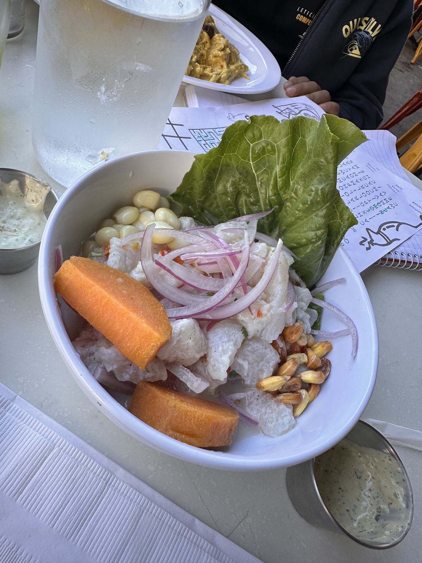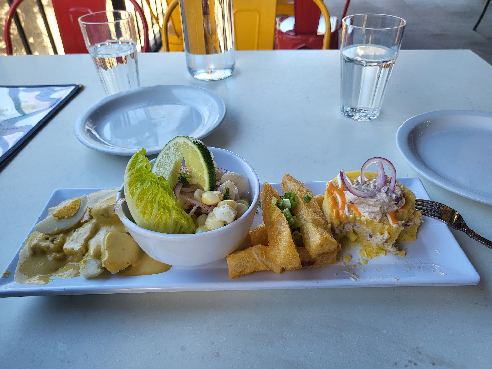 The food was incredible, my daughter demolished both her dishes without pausing (she's 6). The ceviche was a delicious and generous portion that I couldn't help but slurp up the lemon juice after I finished the dish. The yuca fries and chicken in the loaded Yuca were delicious - the chicken was juicy and the fries were cooked to perfection crispy on the outside and soft on the inside - the portion was significant that we had to get a box for the leftovers.