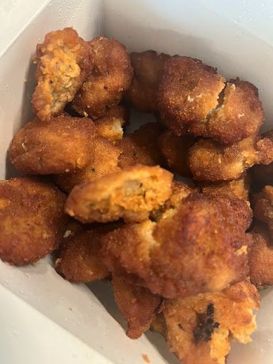 Menu image of the spicy popcorn chicken looks NOTHING like what you get. Not even sure it's chicken. When I opened to look inside a piece, grease gushed out. And...cheese? I think there was cheese in the popcorn "chicken", too?