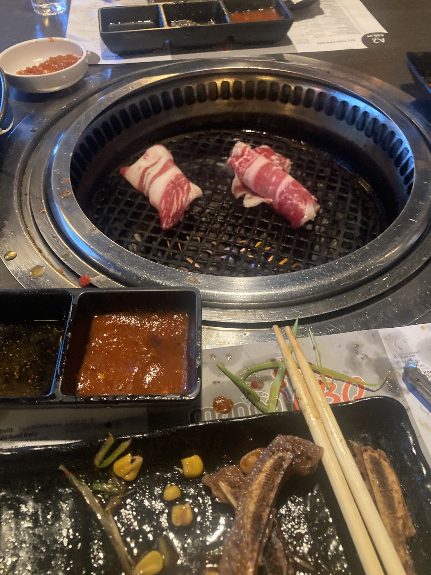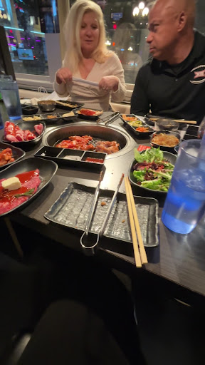 Suggestion to restaurant: scissors should be required for every table and maybe more focus on clearing table and saving space since we were using seating to clear the table ourselves. Was also hard to order for someone who didn’t eat red meat or pork. There’s only a chicken and squid, no shrimp or other options. We also had an issue with smoke point. Think the door needs to be open if the restaurant is worried about constantly coming to shut off the grill. I don’t think you should keep coming to the table to do that which is why I insisted on doing everything myself and cooking...