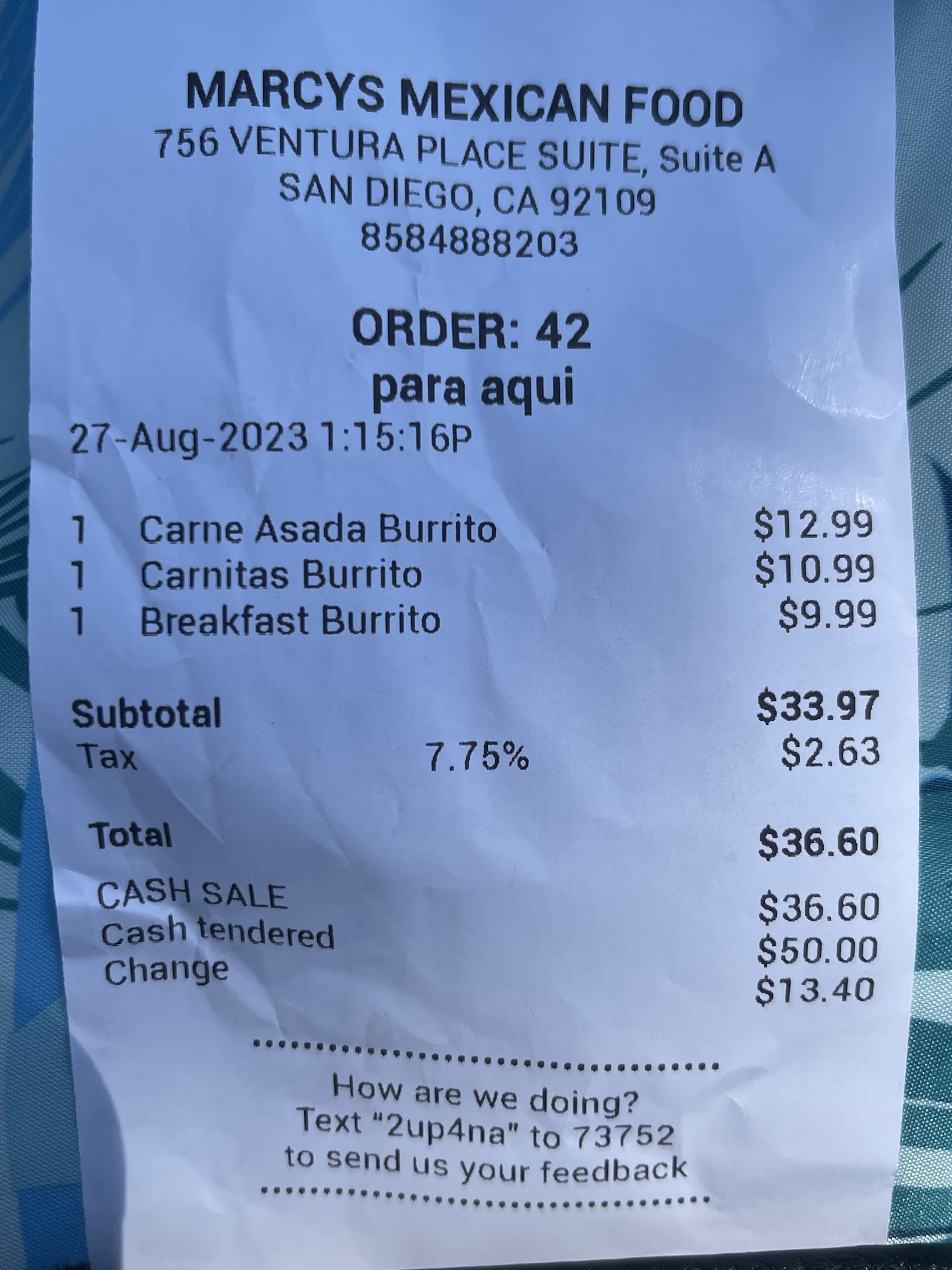 Read moreShould have just gone to the corner shop instead. We ordered 3 burritos (Carne Asada, Carnitas & breakfast). $36 for 3 burritos, Way too expensive for the mediocre food we got. *Carne Asada had reasonable amount of meat but every bite without salsa you can taste the grease from the flat iron. Flavor was blahhh. **Carnitas had good flavor but was so small it was not worth it. Hungry after earring it and ended up eating some of the other Burritos. *breakfast was also blahhh as it had a bunch of potatoes. Every bite big chunks of potatoes. No flavor since the bland flavor from the potatoes covers the rest of the stuff. **Orange Salsas was ok and green one was not good. Too watery for both. Everything just needs to...