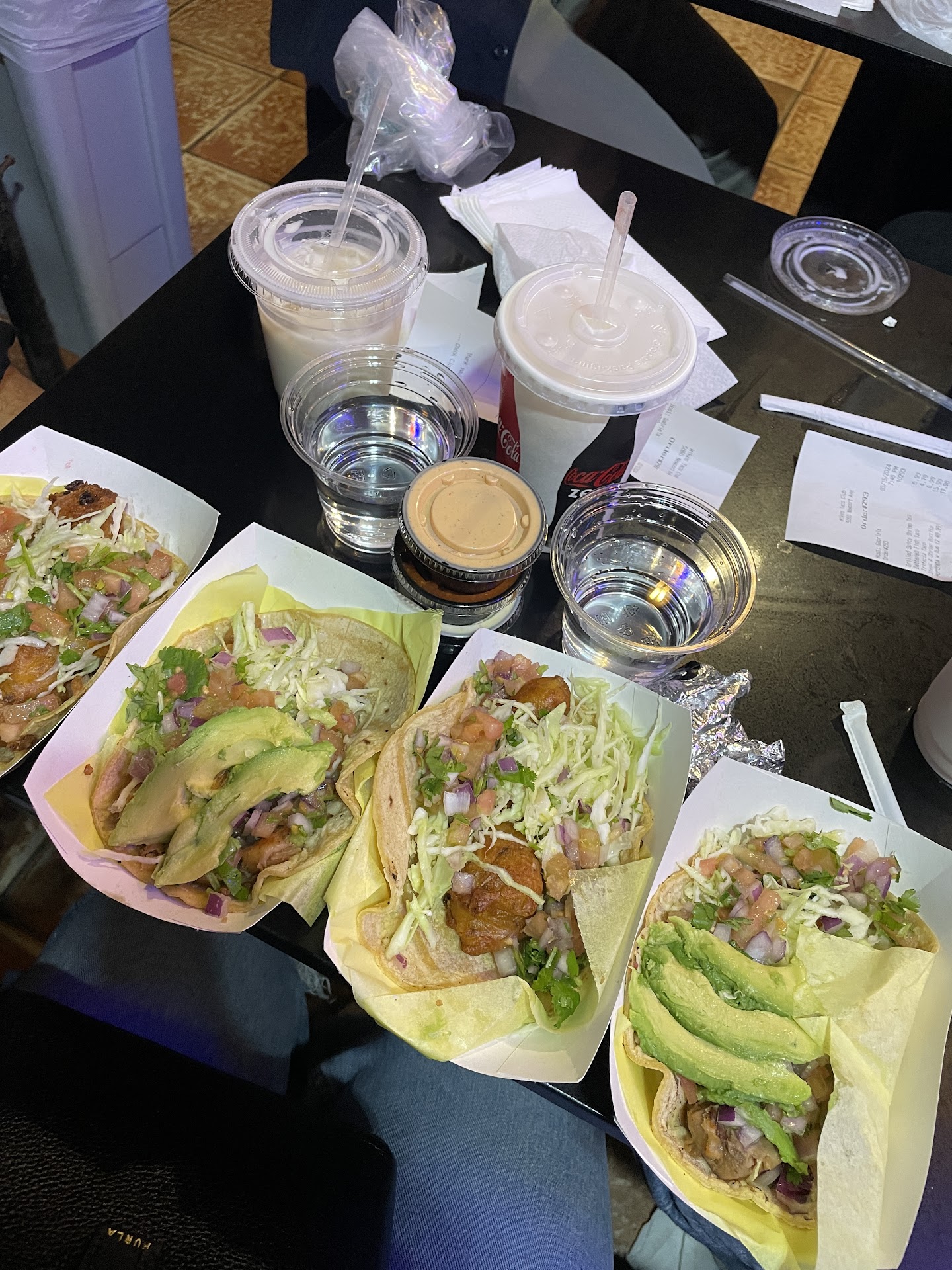 what we usually order aka our go to's tacos: -trifecta taco | fish, shrimp, scallops, cheese, cabbage, onion, tomato, cilantro & avocado -scallop taco | cheese,cabbage, onion, tomato, cilantro & avocado -spicy shrimp | cheese, cabbage, onion, tomato, cilantro & avocado (pretty spicy but sooo good) burrito: -steak and shrimp cali burrito | steak & shrimp, french fries, cheese, onions, tomato, cilantro, guacamole & sour cream -cali burrito | steak,french fries, cheese, onion, tomato, cilantro, guacamole, & sour cream