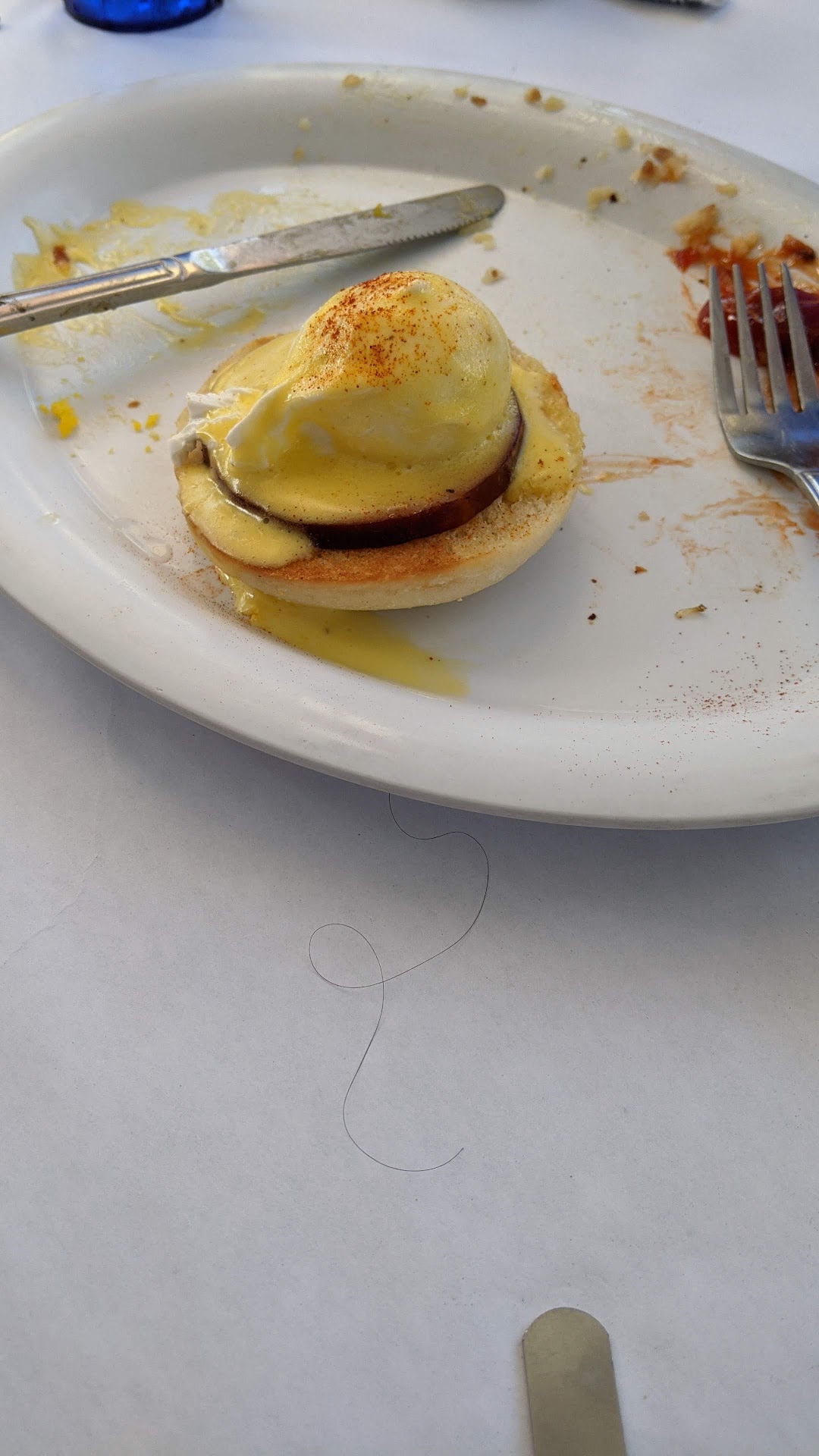 The reason for my one star review has nothing to do with the taste of the food. Let me begin by stating that my eggs Benedict were delicious. Incredibly great tasting and the presentation was excellent. I am one star because when we showed up to the restaurant we talked about the history and how this place is great. It even says on the menu how long they have been around. We look at the menu and soups were highly recommended but I saw the eggs Benedict and I said that is it for me. My wife had a sandwich. To start we gave our orders to our server and we all got our food. My wife got a fruit salad with the meal and to start there was a hair in it. You can see it in the posted picture. I was thinking incredible but I guess it happens. We advised our server and she apologized and brought out a new one. We then shifted attention to my wife's sandwich. I took a picture and she then checked her sandwich and there was no bacon or avocado on it which it should have had as that is what the sandwich was called. Our server brought the missing elements to the sandwich and we were ready to start eating. I ate my first eggs and they were great. There was a second set and my wife wanted to try. I moved my plate so she can try and when I did that I uncovered another long hair from under the plate. I was beside myself now. The food is great but now I am doubting the sanitary conditions of the restaurant. I am sure that others feel as I do being that COVID is already enough to deal with now I have to deal with germs on my food I do not want. I showed this to the server and she was apologetic and asked if I wanted them remade. I said no. What is the point honestly. I just said I will finish my meal and move on. It is not her fault but I did not want to make a scene. I truly wanted to just get up and leave but I was with loved ones I have not seen in a while. Our server asked if we wanted a desert for the issues and I accepted only to give it to my mother in law since that was likely not cooked by whoever handled my food. I liked the food but this experience with the cleanliness was just not acceptable. I thank Jenna for being apologetic and I hope she let management know about...