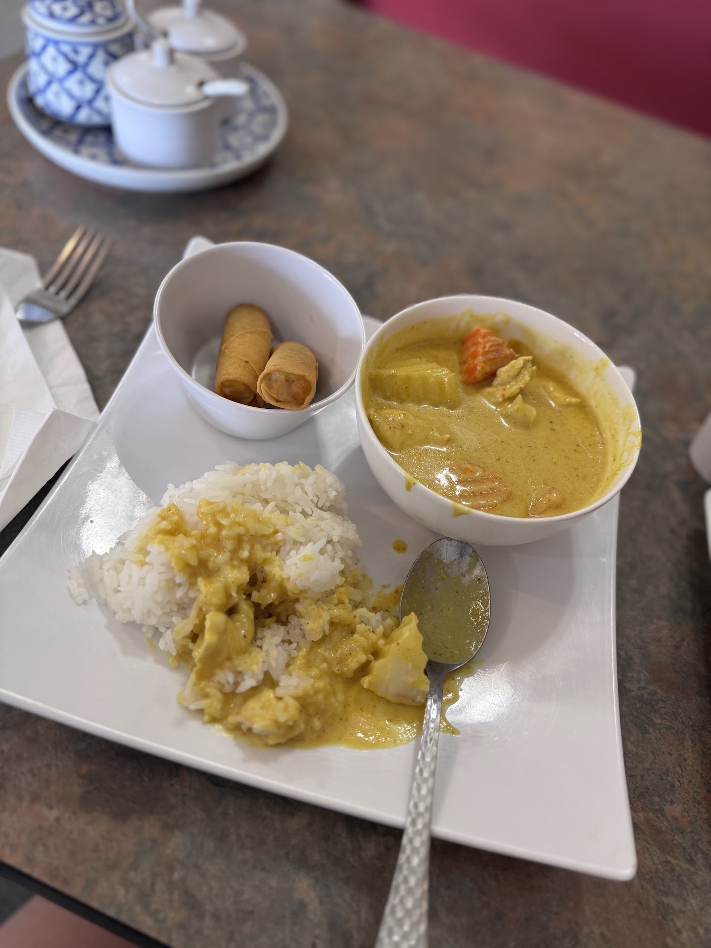 The food was also really good. I often have a hard time finding yellow curry that actually has some spice to it. I ordered the coconut shrimp, fresh spring rolls & yellow curry. All three were delicious. The curry was so flavorful & spicy. My eyes were definitely bigger than my stomach. I had leftovers, the portions were big so you get your moneys worth. 10/10. Iâll definitely be eating this...