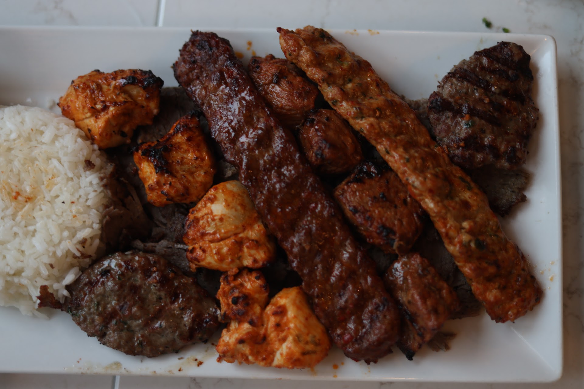 Mimoza Mixed Grill – A huge platter of kebabs (Adana, Chicken Adana, Lamb Shish, Chicken Shish, Doner, and Kofte), served with rice and salad.