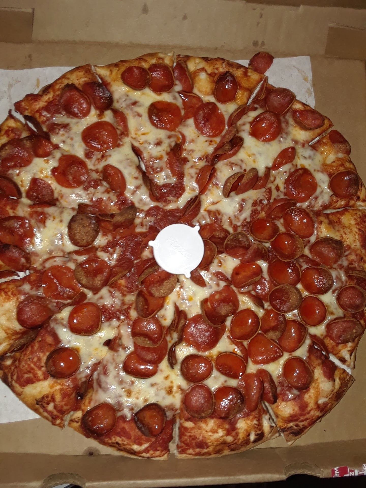 On entering, I observed 1 table with a customer and 2 tables that folks had eaten and departed, waiting to be cleared. Under the heat lamp, half of a pepperoni pizza and 1/4 of a chicken pizza next to 1/4 of a hawaiian pizza were sitting there. The pepperoni 'cups' on the pizza looked to be a little dry around the edges, and the red grease from cheese and sauce sitting together was becoming obvious. The chicken pizza had white and yellow cheese, and chicken in strings, as if it had been pulled severely. The pineapple on the hawaiian pizza was looking a little dry, but the canadian bacon was still flat.