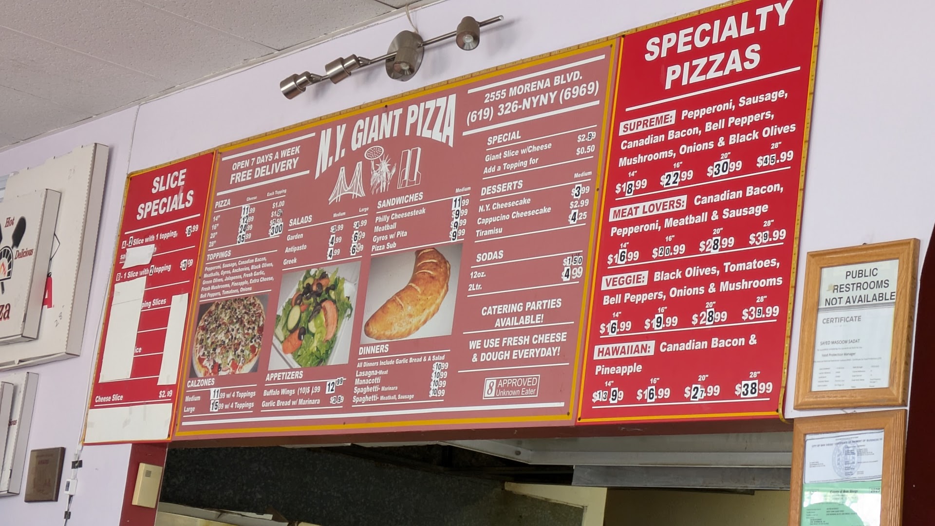 So I'm a visitor to San Diego at least three times a week I come from the Orange county of Anaheim. So this was the first time I picked up pizza from San Diego going back home I checked out this location because it was close to the freeway the guy that works there is pretty much by himself he's an older person and the pizzas are huge being very wide so just be prepared the pizzas are very good I ate a lot of pizza over there an Orange county and this is one of the better ones I've had so give it a try this is very old school Pizza special the location and the guy that works here he must have been here for a while but he does everything on his own looks like but he's doing a great job he's not so friendly but I can see why he's got a lot to do buddy makes a great pizza. And if you're like me and you got a family of three maybe even 4 a 20 inch pizza will be just perfect because you'll have a couple...