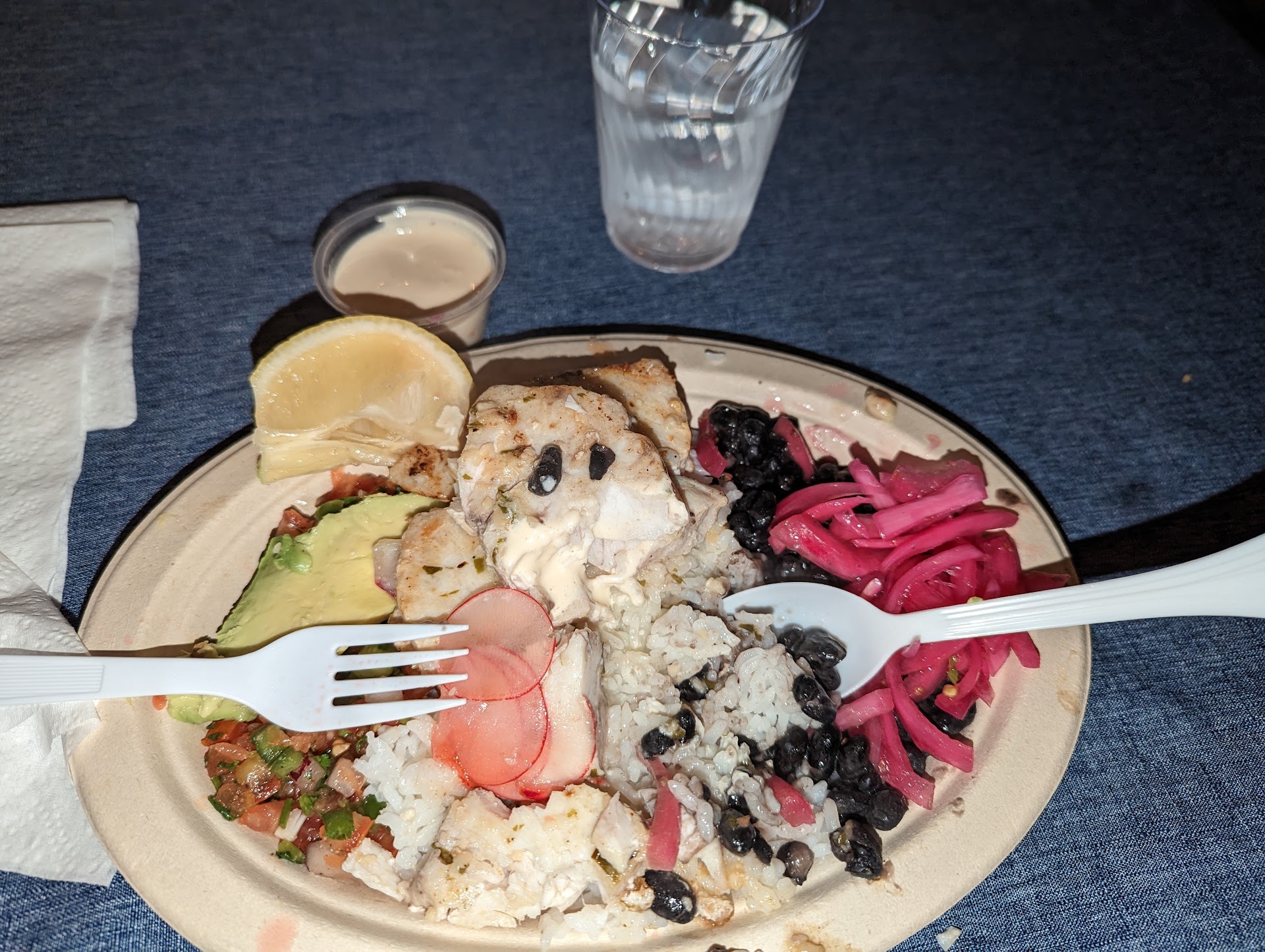 They had grouper, ahi, yellowtail, and sea bass. Everything was sold out but the sea bass. I happen to like sea bass, so while grouper would have been nice, sea bass it was. As noted because it's an outdoor venue, it's very unassuming. When my plate arrived? It was a paper plate with plastic silverware. But it looked fresh and yummy. First bite of fish, good clean, simple flavors, I think I'll like this. Second bite this time with some of their aioli sauce, even better. On the plate was black beans, white rice, fresh pico de gallo, and some avocado slices. Slices. I began to mix all that up and eat it with pieces of fish. Damn this is good. Three or four bites in, I just let go and started pounding. Simple clean fish simply presented, just good old style side-of-the-road grilled local catch. I actually love this kind of seafood. I'd rather hit it then the expensive pretentious seafood restaurants down the street. Support the local guy, it's always fresh, and you know the focus is the fish.