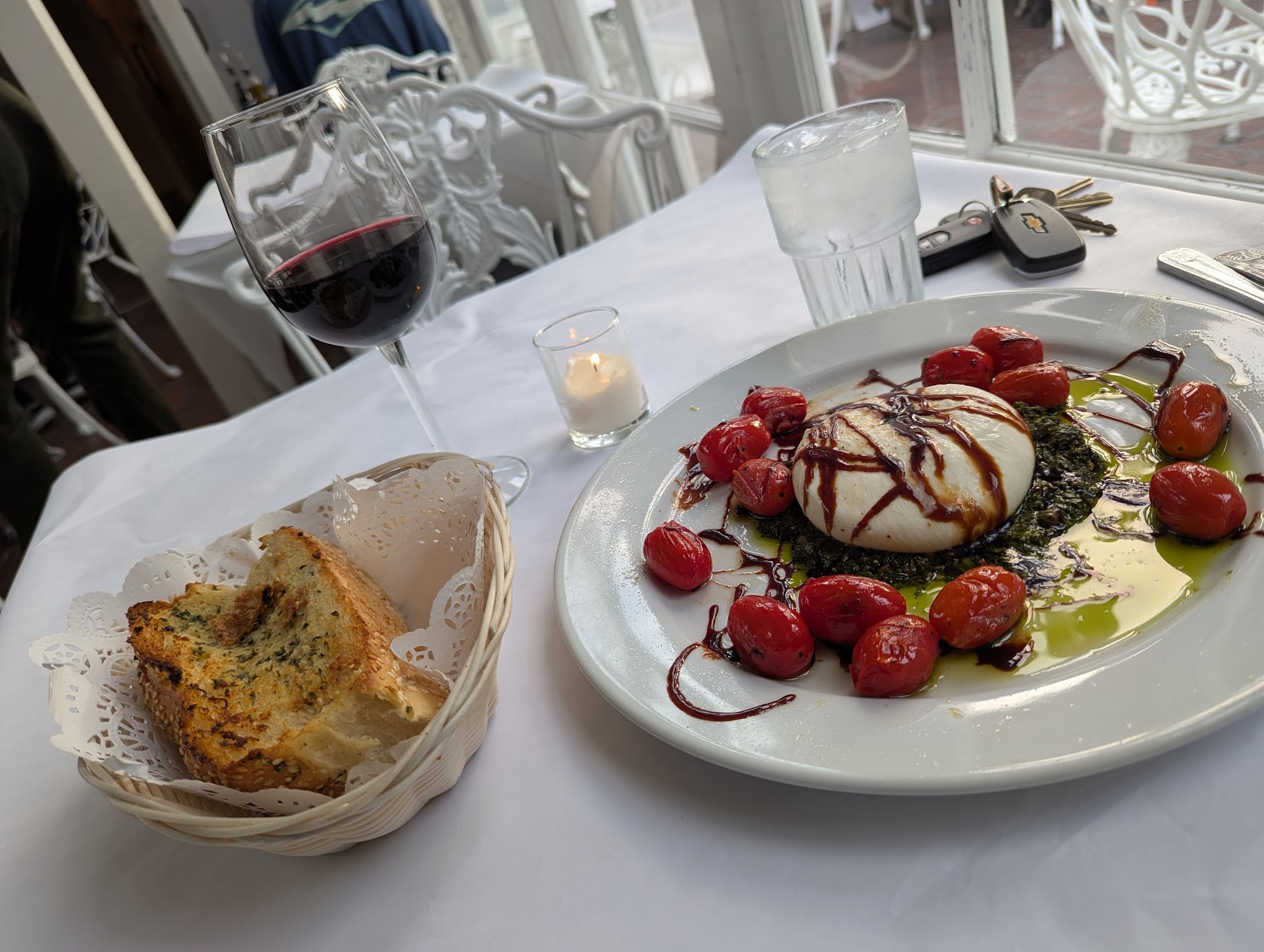 The burrata arrived, a sad lumpy pancake sitting a top a bed of pesto that was spooned out of a jar, and it wasn't even the Kirkland stuff. A couple cherry tomatoes rolled around the plate, swimming in a shallow pool of uninspiring olive oil. There was a balsamic drizzle but it's not balsamico. Nor is it a reduction. It is what's called "balsamic condiment", a synthesized balsamic glaze loaded with sugar.. some versions don't even have balsamic vinegar in the ingredient list. This one may fall under that category. Served with a loaf of garlic bread, unsliced. The bread was actually decent. The burrata? Fuhget aboudit.