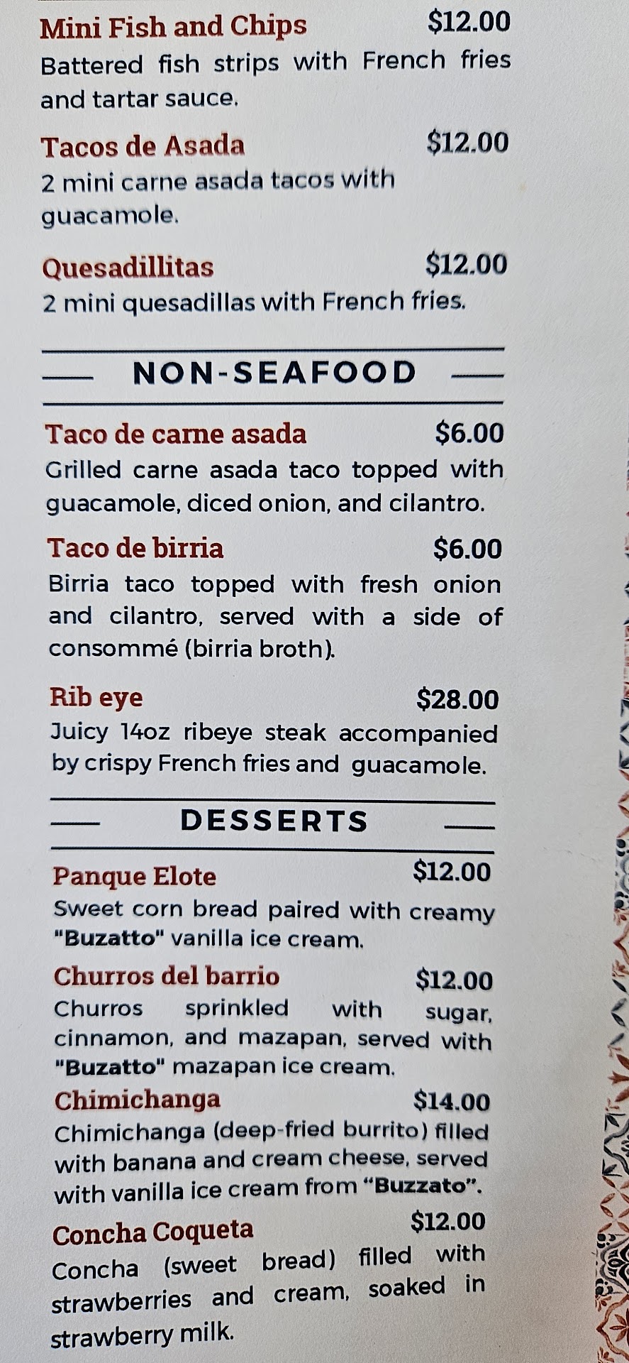 We came on a Sunday afternoon. The wait staff is very friendly and puts us at our table. When we looked through the menu, we realized that it was mainly seafood. However, they did have non-seafood items, but there are only three items. Which was no big deal.