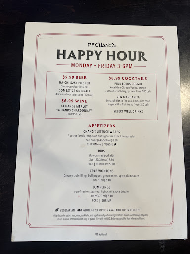 Read moreNovember 2024 updates- The last 3 months I've been ordering to go food from this PF Changs location and had pretty good success with tasty warm meals. This is much improved over prior years and my original post below. There are many new additions to the menu as well as more vegetarian options. The staff has been very congenial and helpful and seemed to really enjoy their job there. I've updated my original three stars to five stars enjoy! Most P.F. Chang's locations tend to be reliably good with a nice variety of foods items and fairly good table service. However not this one. I first went to this location shortly after it opened and have continued to find it problematic. The meals and service I've experienced have always been in the unacceptable range. Here's the usual run down: 1. Wait 15 minutes to 1 1/2 hours for a table as they are usually very busy 2. Get your table but have trouble getting your servers attention to order anything 3 Get your order in but wait a long, long, long time to get it. Many times the food at the same table comes out at different times to different people-ugh. Or the meal comes out before the appetizer. Or the soup or side dish is completely forgotten. I have even gotten my drink after the meal was served. If you have any issues with your food or need something as simple as soy sauce don't expect to get it quickly or at all. 4 Try to flag down your server to get the bill because you're late for your next meeting. About a year after the last time I was there someone invariable convinces me to go back. I always have the same results-not good. For example I have had watered down soup- the Wonton Soup, very bitter and heavily salted items-Coconut Curry Vegetables, chewy overcooked nearly inedible shrimp-Crispy Honey Shrimp and Walnut Shrimp with Melon, and most soups with not much in them except a watery-soy sauce broth. Many times food is cold or room temperature, not hot. Poorly made entrees I think I can fix (like the curry dish) I bring home and doctor them up to eat the next day for lunch. Obviously this does not work with overcooked shrimp. The website is less than helpful with Happy Hour menu only having drinks and no food items listed. The noise level at this location is so loud talking to your dinner partner is nearly impossible. With tile flooring and glass surrounding most of the restaurant it makes it very reflective of sound. Parking has always been an issue for me here. I was told on my last visit that the valet is free and the hostess validates parking for the garage next door but have not confirmed either of these. I've frequently found the parking garage next to the restaurant -which is expensive-will be full or have a broken entry or exit gate. If you've read this far I will pass on my Feng Shui for the design of this P.F. Chang's. I am completely convinced that one of the main issues with this location is diners eat their meals looking at the rear ends of two giant concrete horses which stand on either corner of the building. Insider tips: If you have to go here for a meeting eat at the bar. Usually you'll still wait for an opening but not as long as a table. The bartenders are more attentive and faster than the regular table servers. Share a meal with someone else in case yours is bad. Ask the server what the best selling entree is and order...