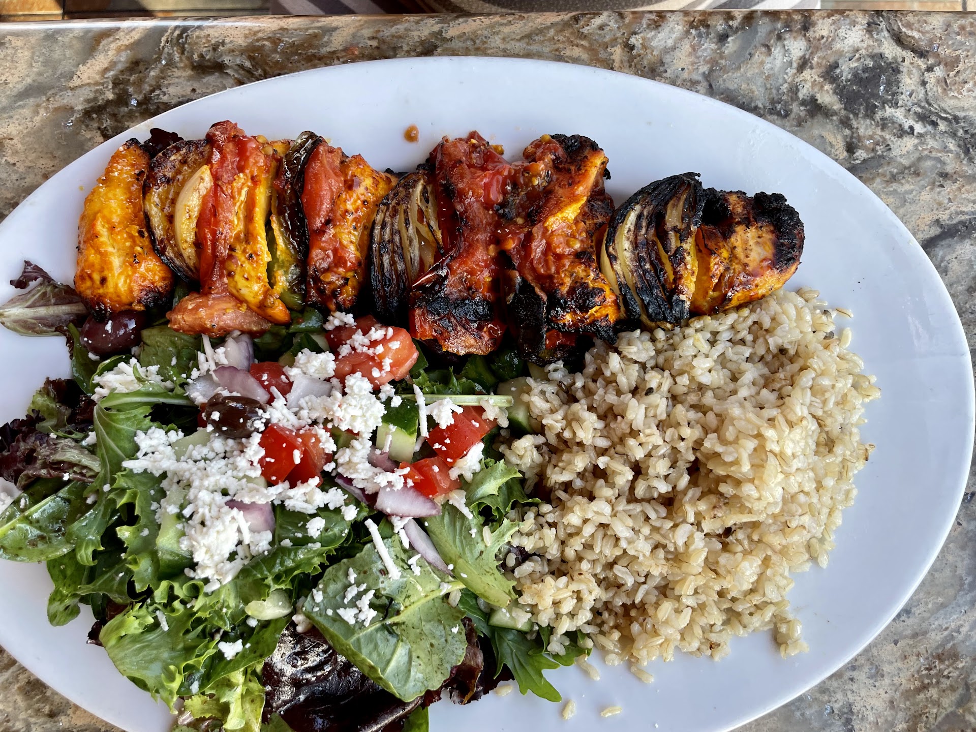 My wife got the chicken kebob plate. The ๐ was very very tasty. The kebob made better because of the tomato ๐ and white onion ๐ง that grilled along with the chicken - a seemingly clean version of a chicken parmigiana (no cheese here). There was a simple salad and some brown rice, both good complements but nothing like the kebob. It was ๐คค.
