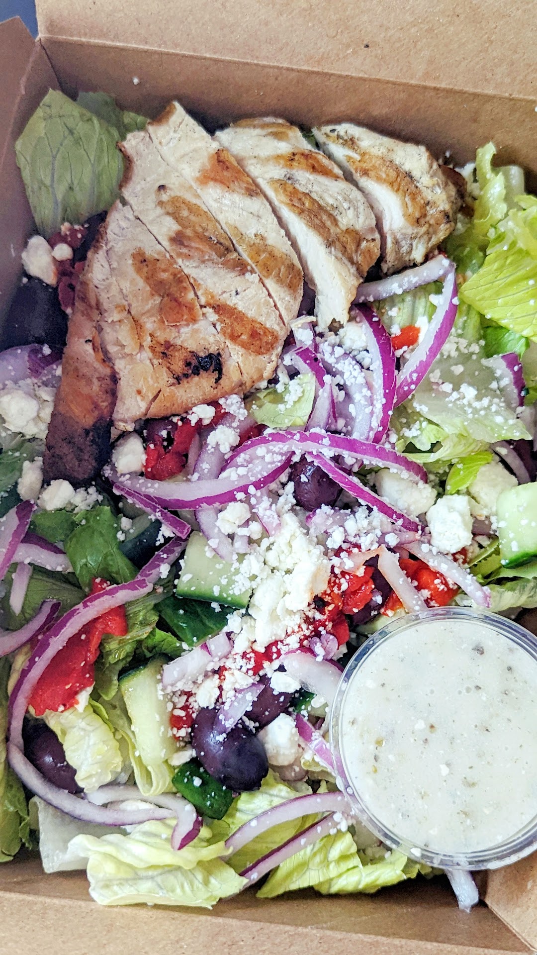 Generous serving of chicken there and it was cooked right. Not dry or rubbery or anything. I was actually very surprised by the amount of lettuce in there! They actually filled up that entire to go box with letters before adding the toppings on. Feta was really lovely on top as well.