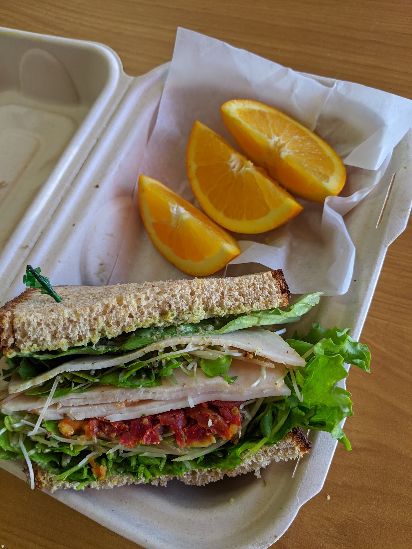Ā Ā Ā Read moreThis sandwich was INCREDIBLE! I got the sun vege with turkey and ohhhhh man it was tasty and in line with a diet (I had eaten half before taking the photo)! No mayo, but amazing pesto. Sprouts, lettuce, sun dried tomatoes, provolone cheese on multi grain bread?! With unadvertised orange slices?!?! AMAZING. It was tasty, nutritious, and a nice break from a chain store sub.