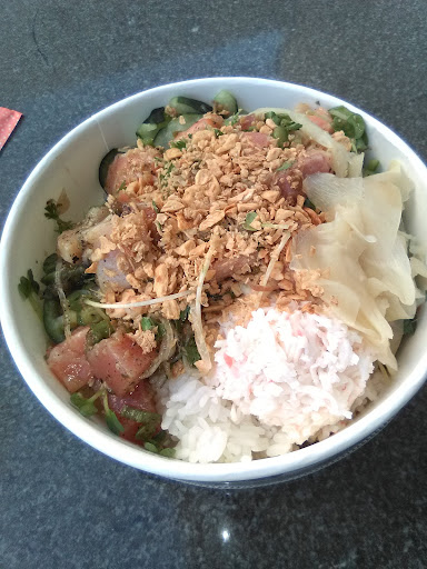 I had a 3-scoop bowl with the marinated tuna, the seared albacore, and the salmon for protein. I added rice (half and half of the sushi rice and Brian rice since I couldn't decide), all of the sides, spicy mayo and sweet sesame sauces, green onion/daikon radish/sprouts/masago mixes, and crispy onion/crispy garlic/nori/furikake toppings. It all tasted fresh and amazing (and the fish had a great texture).