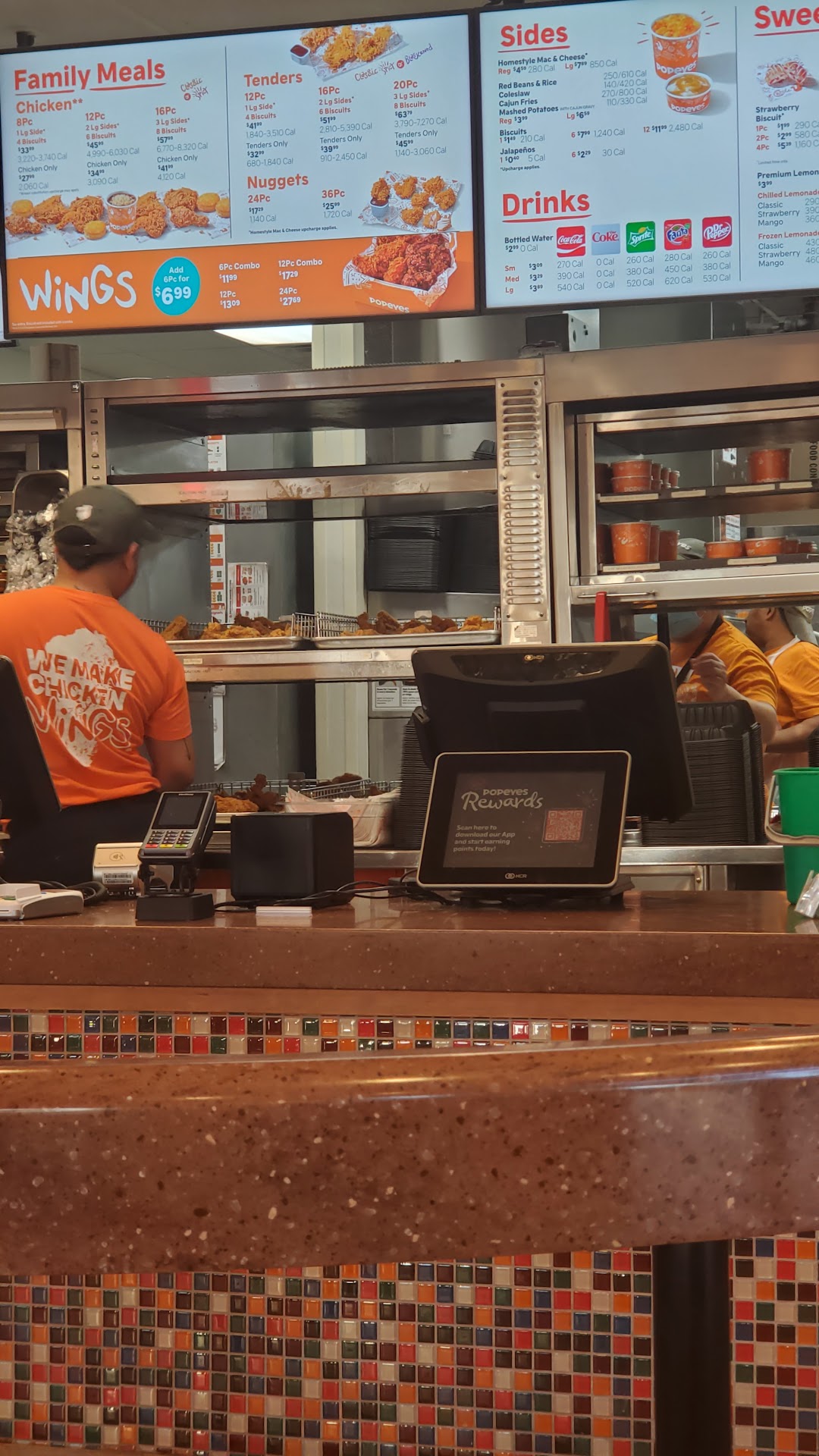 Here at Popeye's the drive-thru and walk-in is always packed. Always slow. And non-accommodating. You can enter the drive-thru two different ways which occurs a parking lot jam. If you are parked and eating inside you can possibly get stuck because the drive thru cars are blocking your car. I am beside myself that the community patrons this business with such unfair pricing and gouging. It's Popeye's good people.
