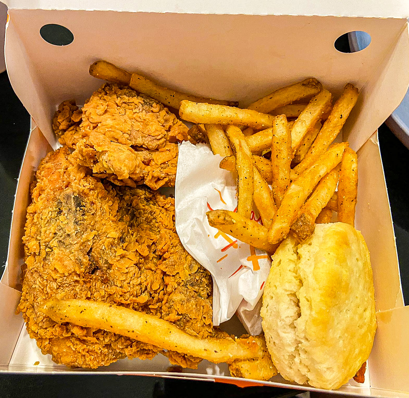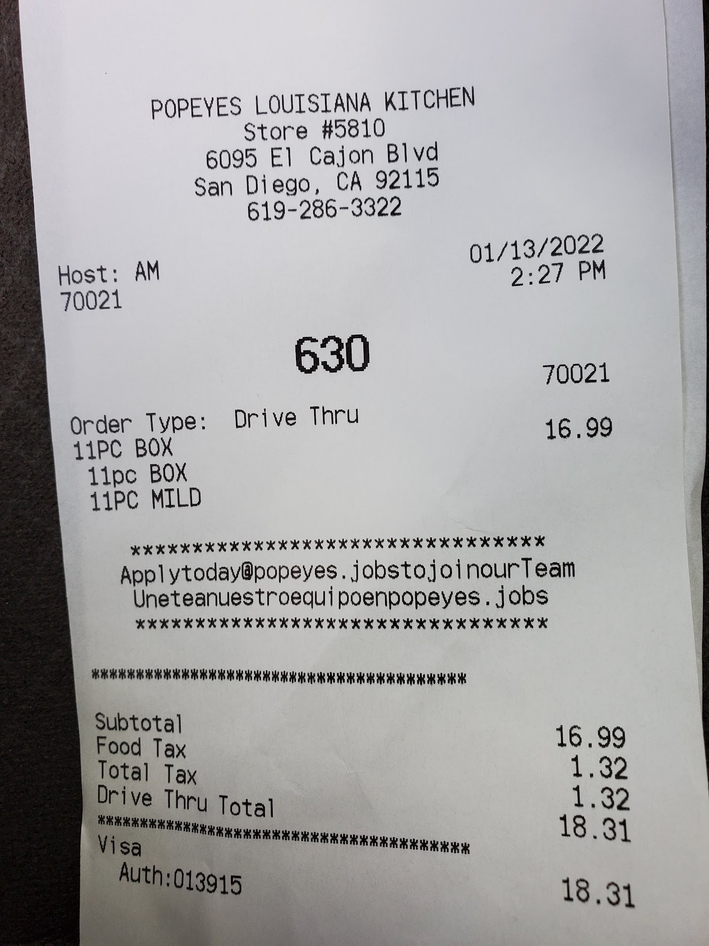 Read moreFood is awesome, but that's why we go to Popeyes. Service however is not. Ordered online, 2 orders /4 items total (they got me with the $5 spicy box)went to drive thru, (long wait, but that's ok) finally get to the speaker, the young lady can't figure out how to spell my name it's 6 letters, I annunciate well, letter by letter, she can't find either of the orders. I try to tell her what my order was, she is still trying to spell my name and finally tells me to come to the window. I get to the window, spell my name yet again, still nothing. I'm looking at my emailed receipts, she wants me to enlarge my name, it's not on the receipt, finally I pull out my driver's license, aha, magically it's the bag right in front of her and looks at a couple more bags, I get my 2nd order. Now I'm back to my hotel room (so this is it for options of what to eat) get back and I didn't even get all of my food. I was so happy to get my order, I didn't check...my bad. But it really sucks. I called, got a machine. I'm sure I'm just out the sandwich, as I'm not driving back. Maybe they will credit??? Who knows. Better luck next time and I'm...
