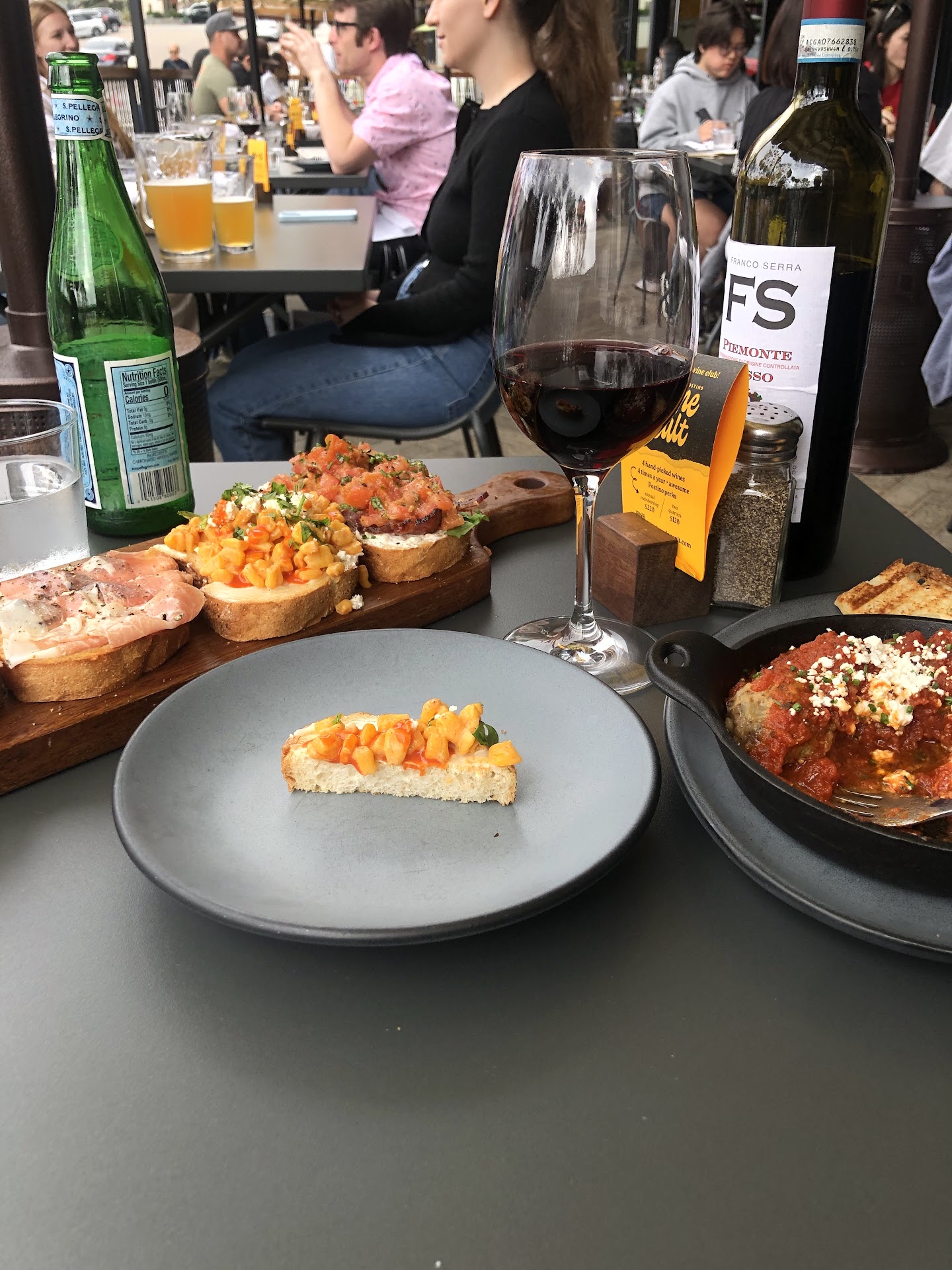 There is a special that they have on I believe Tuesdays. It’s bottle of mid priced but great wine and a board of their bruschetta. They come in maybe 8 different types with my favors being the fig and ham, bacon and arugula and the Elote one (highly recommend this one), and I save a wild card for each week.