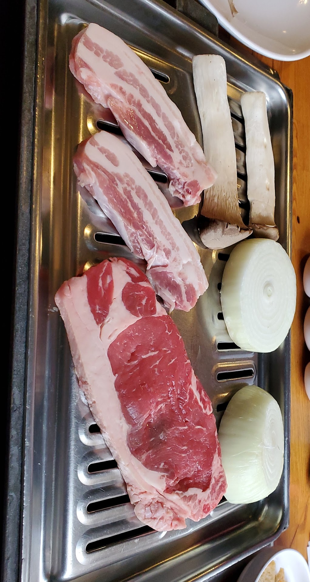 We had a party of 8, so we called around to see what the wait would be like at the usual places. One was 45 minutes and the other was 45 to one hour. We really wanted Korean BBQ for our out of town guests, and then we saw Prime Grill. I called ahead and told them we were a party of 8, and they said no wait. We pulled into the parking lot and saw an attendant there, making sure people were parking there only for the restaurants in that area. We quickly found a parking spot. We walked in and they were able to seat us right away. We all ordered the basic one at $19.99 a person. We had two tables between us, and therefore 2 cooking stations. They use gas grills here. Their grills are designed to channel the grease away, and not on the fire below. The grill never went out once, and they never came around to adjust it like they seem to do at other places. One place seems to like to turn it down, perhaps so our food will take longer to cook, and we'll get full faster. They also start taking forever to bring the meat. Prime Grill did take a little longer for each iteration, but nowhere near the lengthy delays of the other big places. They also use electronic ignition on their grills, so no difficulty getting them lit. Manna BBQ I think is electric, and TGG is gas but requires a lighter to light them.