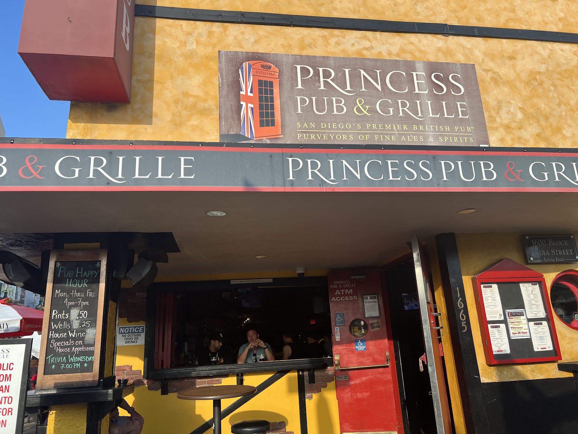 Iâm writing this review about our recent visit (on June 20, 2025) to Princess Pub & Grille in Little Italy â located at 1665 India Street in San Diego, correctly identified as Princess Pub & Grille tripadvisor.com +6 sandiegorestaurants.com +6 littleitalysd.com +6 .