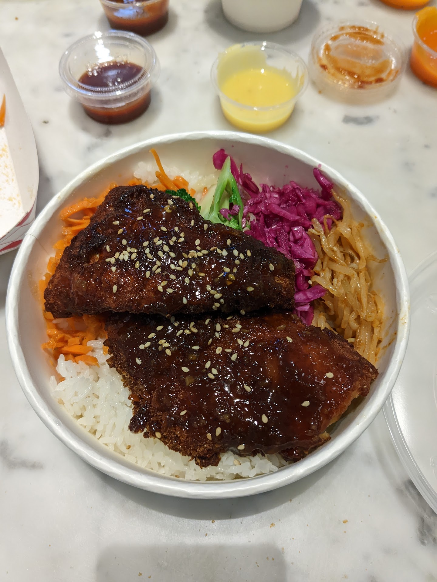 Read moreThe cashier with short hair and glasses was extremely impatient and unfriendly to me. Before I could finish asking her "How big is the portion for the fries?", she quickly grabbed a rice bowl and waved it in my face, not realizing I was not asking about the rice bowl. Her entire demeanor changed when not one, but TWO white couples after me placed their orders; she even laughed and smiled at them while I was waiting for my food. I feel so sad that some older Asians treat other younger Asian people this way. I am not Korean, and clearly do not look like one, so it was obvious why her attitude was like that. Food was average and tasted like regular fast food, but the service left a bitter taste in my mouth. At least the other woman who handed me my food...