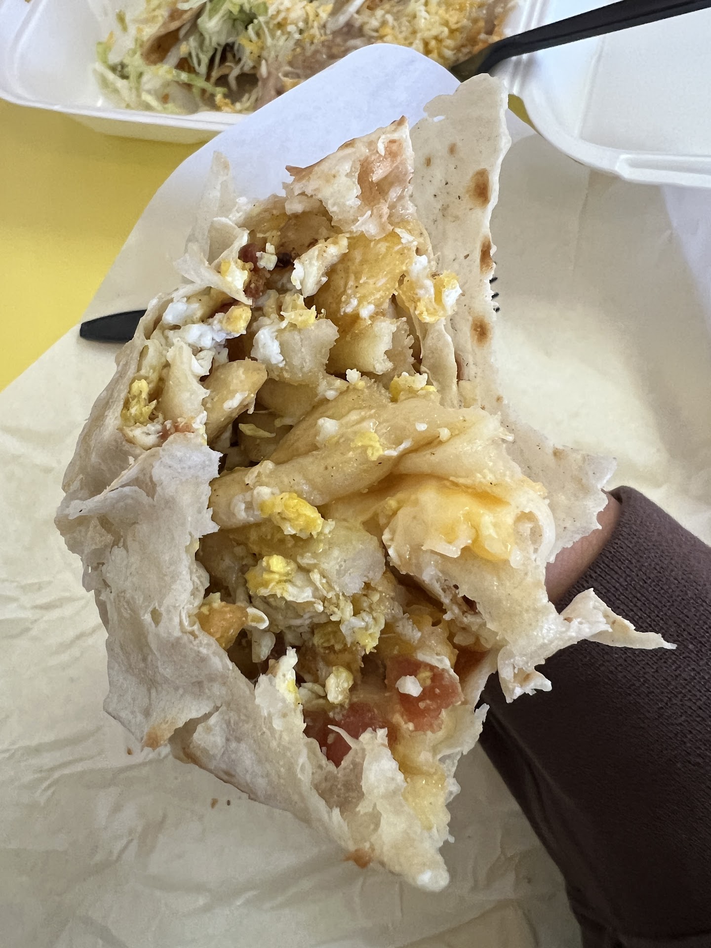 The worker is very kind and waited for us to be ready to order. They have a lot on the menu! I got the breakfast burrito, which is egg cheese, bacon potato, and she got two tacos with beans and rice.