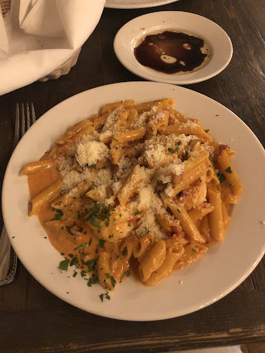 Looking around, the other guests all seemed to have plates with large portion sizes and this was also our experience when we ordered. My husband got the mushroom risotto and I got the shrimp & pancetta linguini with the vodka sauce, although I subbed gluten free noodles. They have GF penne pasta that can be subbed for regular noodles (although Iâm not sure if that works with things like ravioli). Our food was phenomenal! The risotto was cooked Al dente, and had a great cheese and mushroom flavor. The shrimp in my pasta (4 pieces) was very large in size and cooked perfectly - juicy and a good pop in the bite - not too chewy. There was enough pancetta that I felt like I had some with every bite. The vodka sauce was fantastic, with well rounded flavors!