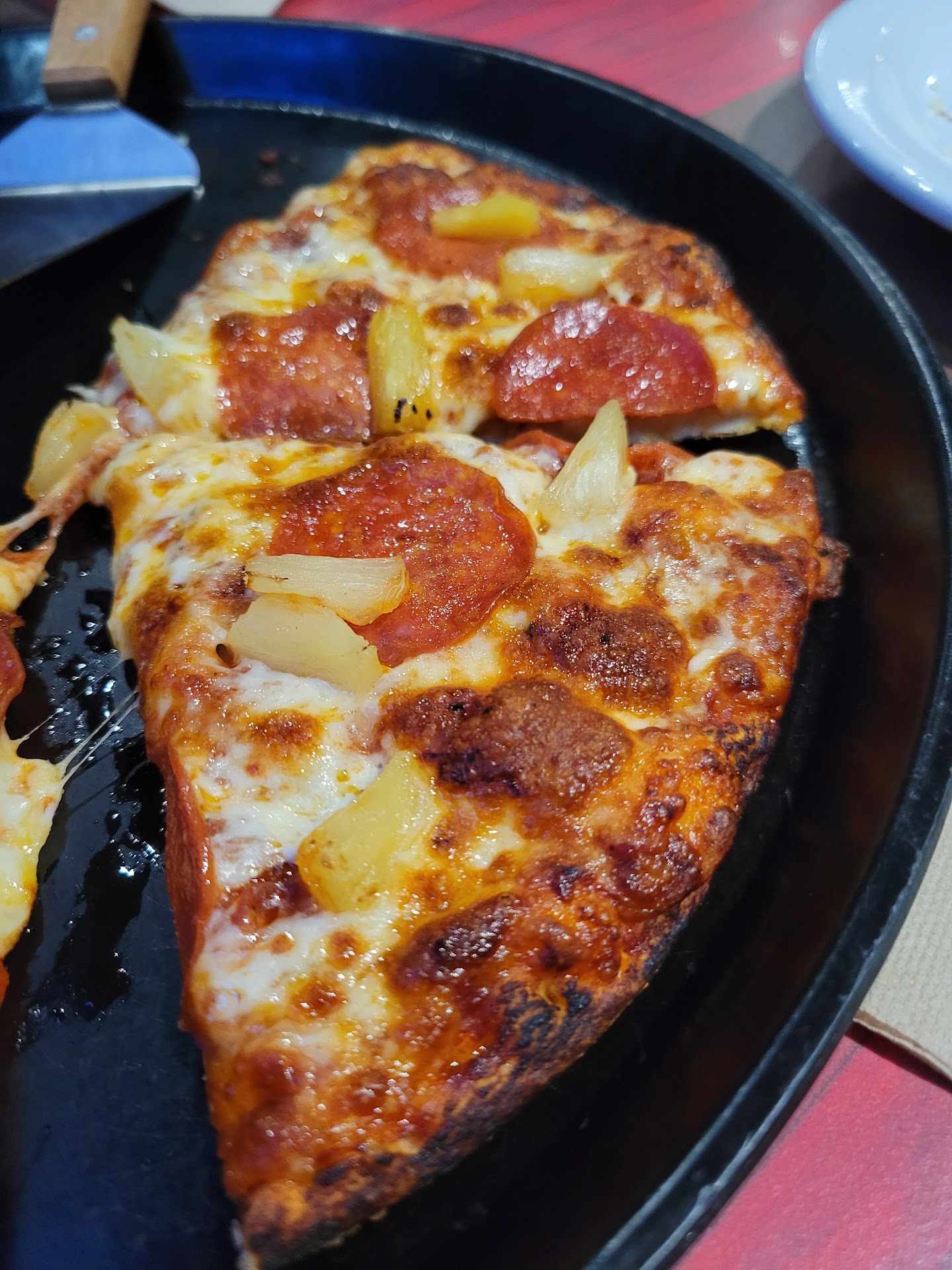 Food came out together and didn’t take long. Tasted great as round table pizza should.