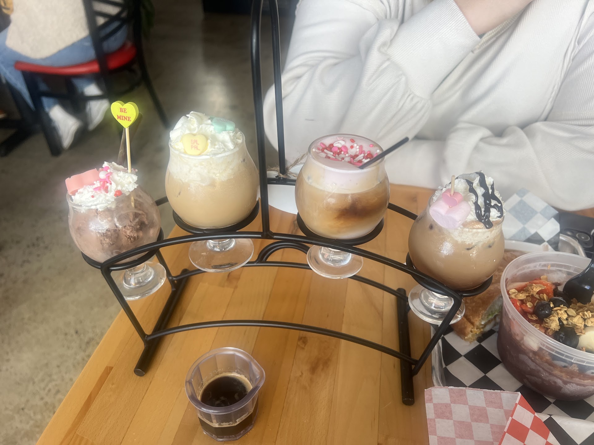 overall a terrible experience. we went here after seeing the cute viral Valentines Flight online. upon ordering it, we were met with rudeness from the worker, telling us AFTER we paid that she wouldn’t make it for us until we got a table. so we were then forced to stand and wait for a table to magically open up. we waited +30 while no new customers came in. The workers did nothing to help expedite this situation and simply watched us stand there. she finally gave us a table at the VERY back by the storage bins and handed us our watered down melted ice coffee flights. they pulled the espresso shots in mass production, so it had gone burnt by the time we got our seat. absolutely disappointed and...