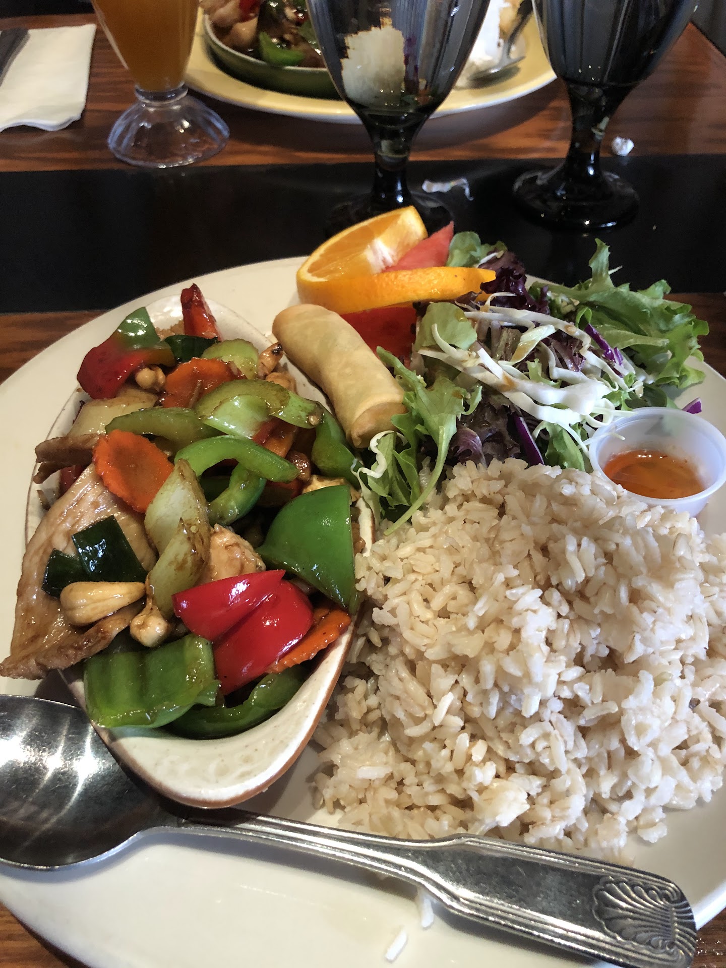 Now, after reviewing my photo of my entree, I realized that it consisted of: basil, broccoli, mushrooms, carrot slices, red bell pepper, a few slices of zucchini, baby corn, green beans a couple of pieces of onion and cabbage, and a sprinkling of bean sprouts. I definitely tasted the sweet taste of basil, and garlic sauce, but the rest of the dish didn’t really match the menu description. It was good, mind you, just not exactly how it was described. I ordered spicy level number 6 (on a scale of 1-10) and it wasn’t spicy at all.