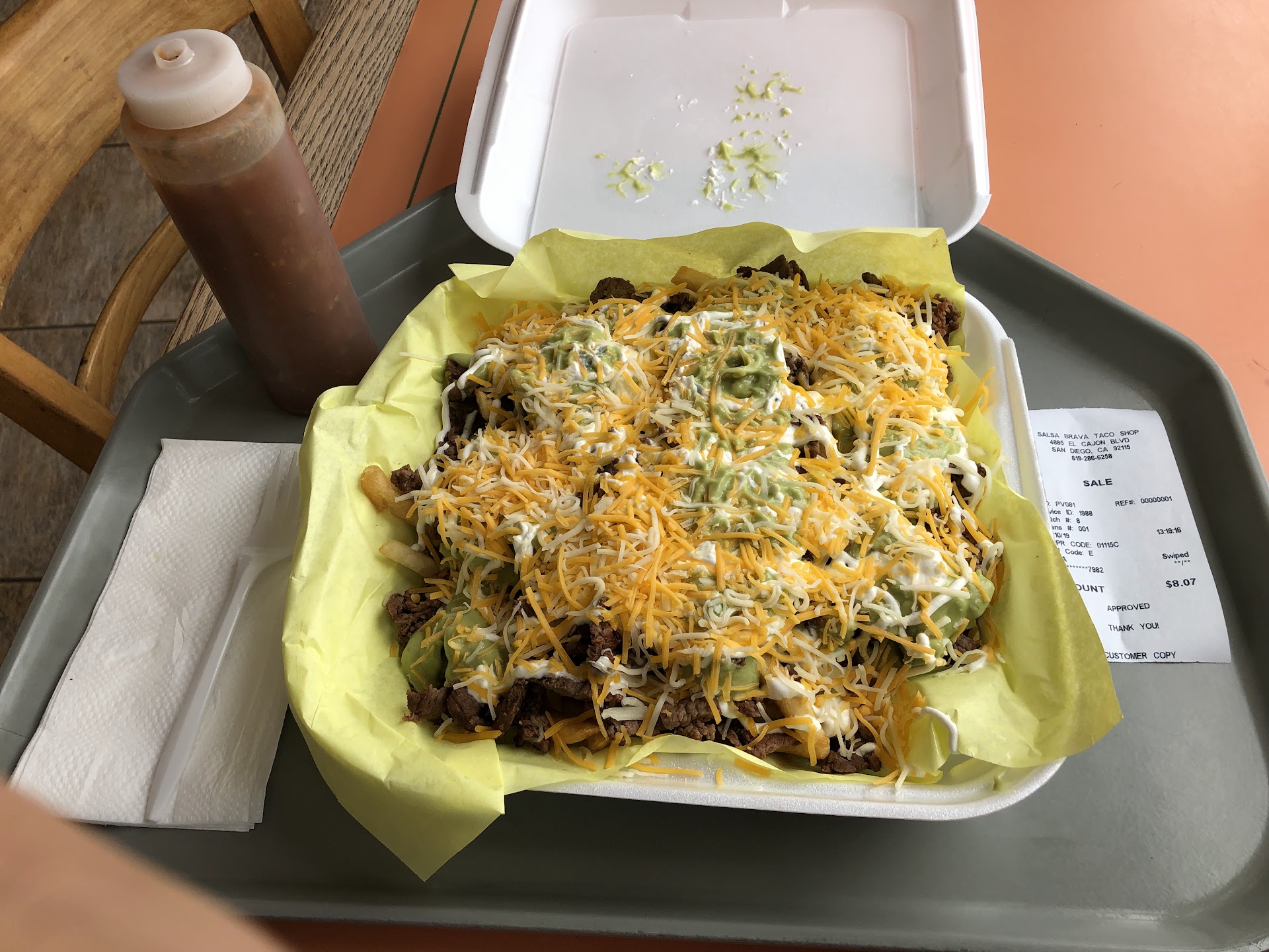 Read moreI get Carne Asada Fries at every mexican place I go to as my benchmark. This place was ok. The bad: the fries were not fresh made. They were a little stale and wrinkly, and in Carne Asada Fries you need good Fries. The rest was fine. The meat was good. And the best part, it's loaded with sour cream and guacamole, which I love. The salsa is a pretty basic pico, but it did have a little spice to it. I'd prefer a salsa roja, though. The Fries were a good price though at $12.99.