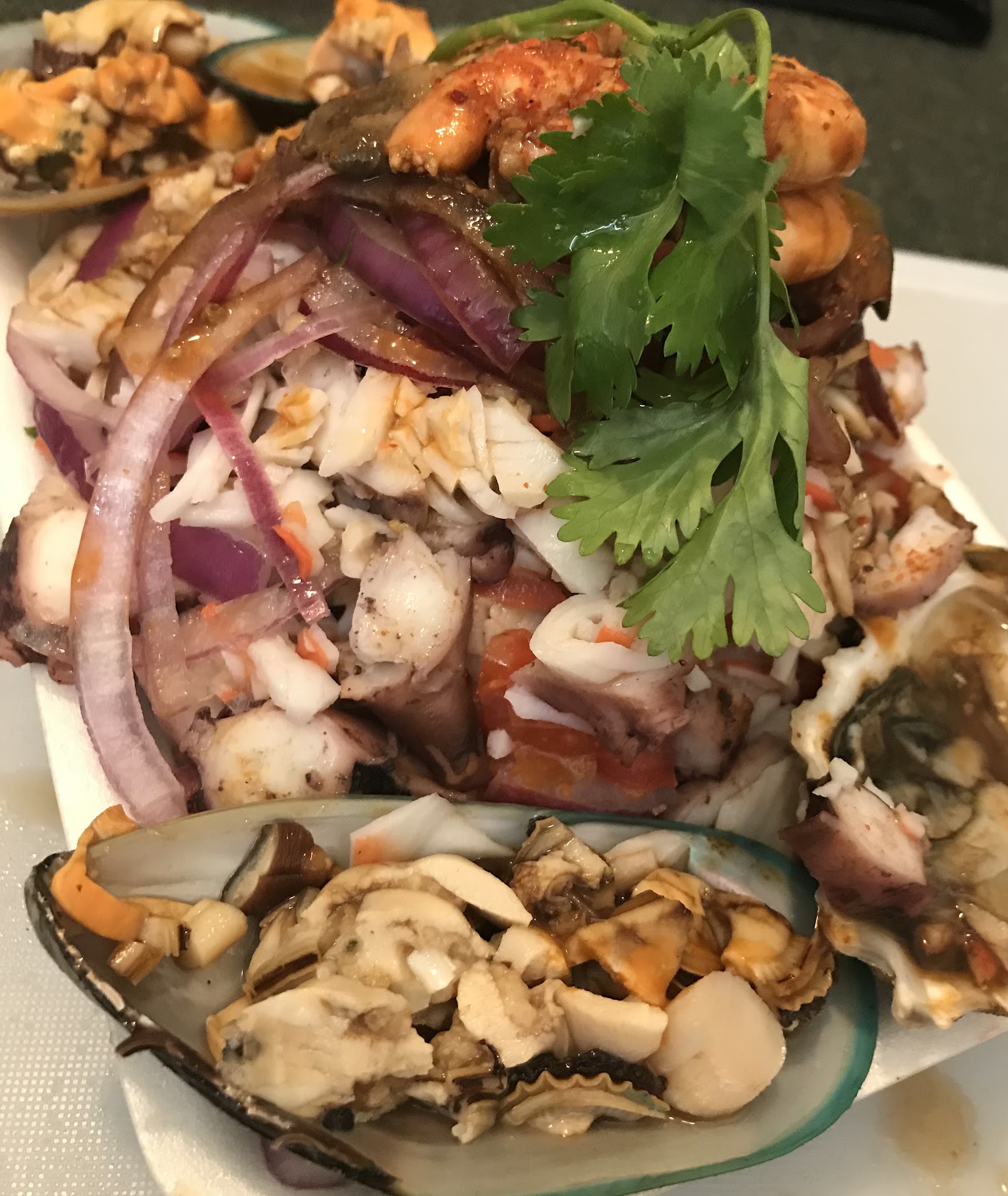 In the before days, I recall a truck serving up a similar menu, with the exact same business model, called Oceans 97. Mark Wiens reviewed it, I went and loved it. I don’t know the significance that the truck now says “57” on it, but gave it a go. First off, prices have gone up significantly, Being a food service person myself this is understood as food and operating cost have doubled since then. They are not greedy corporate overlords. To the contrary, I found the alacrity of service and hospitality lacking these days of disgruntled workers. My tostado loco was a bit different from previous visits, with three geenlip mussels and one diced oyster framing the oversized, two meal affair. The seafood was fresh and adequate- mostly resilient octopus, poached shrimp seasoned with tajine, and flakes of a sea bass like fish. This salpicon of sorts sported cucumber, red onion, and tomato in a way that seems un-unified to me. Let it macerate a bit more to break down into a more unified leche de tigre. Overall I enjoyed ( add that habanero salsa and a bit more lime). The oyster tasted off- and concerned me but did not suffer the revenge. The taco Gobernador was one of the better Ive had but $6?. PersonallyI think it used to have an edge up, but that was then. Four stars is still damned good, and in my...