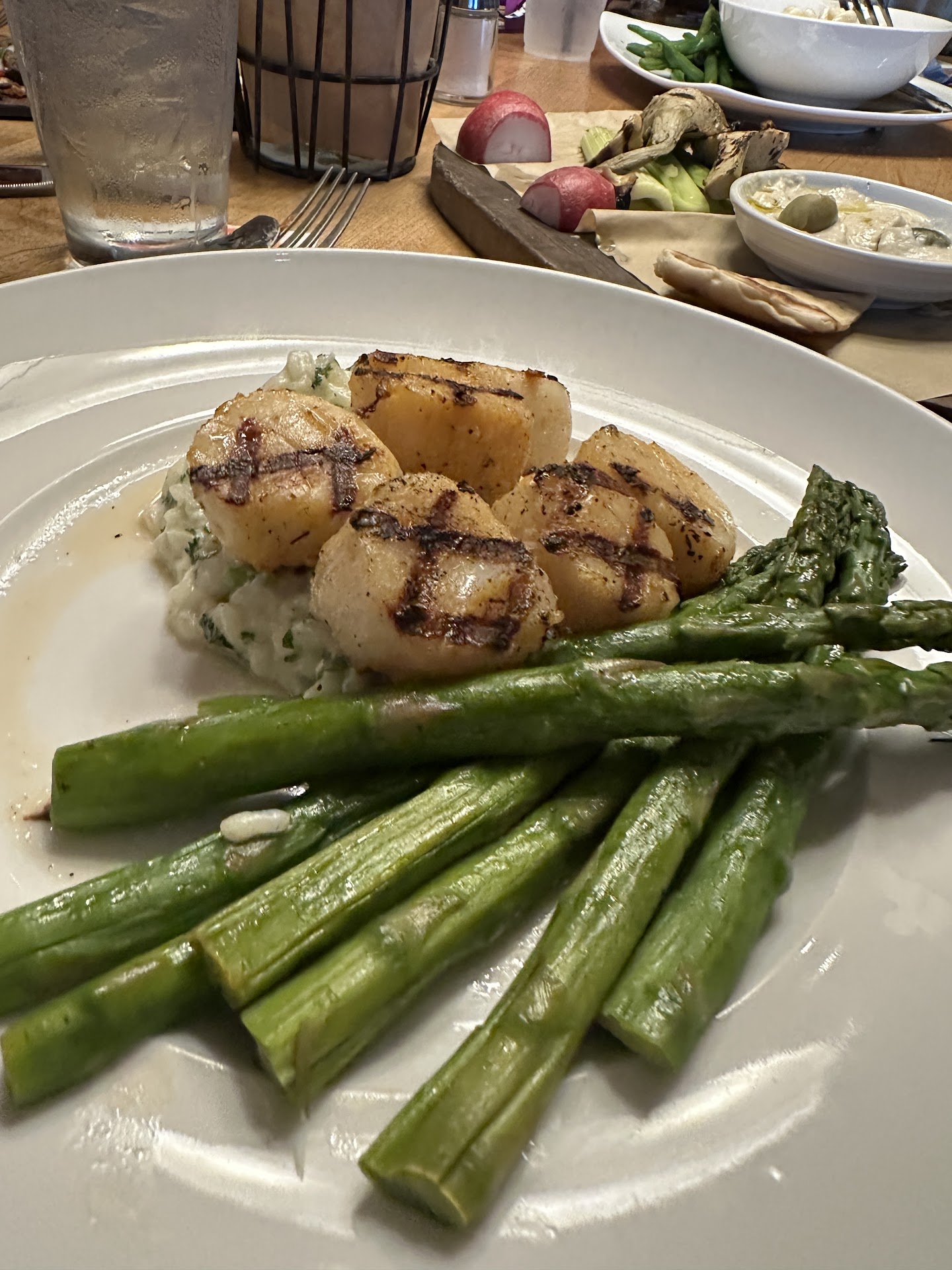 We have been to Season 52 at the UTC Mall on many occasions over the years and never left a review. Last night, our family was shopping at the mall and decided to have dinner at Season 52 because this restaurant serves rotating seasonal American specialties/dishes. Also, we didn’t need advanced reservation on a busy Saturday evening at a fancier American seafood/steak restaurant. We were seated within 5 minutes of arrival. The interior has a warm and relaxed vibes. Our server brought us menu immediately and told us that they just changed it to their Spring menu. Some of us are lactose intolerant and we were surprised that the server brought us the lactose free, gluten free, vegan menu. Server told us that the chefs could make adjustment to the main menu dishes to meet our needs. We were pleased to know that. Also, server told us that they use butter very sparingly, if used at all because most of their dishes are under 590 calories per dish. We ordered the thin-crust pesto chicken and fresh mozzarella flat bread, slow-roasted grass fed beef meatballs in tomato basil sauce and grilled artichoke with lemon hummus as starters and they were brought up very promptly. Server also brought the complimentary pizza bread. For the main entrees, we ordered grilled salmon with salad, caramelized grilled sea scallops with mascarpone risotto and asparagus, wood-grilled dry-rubbed pork chop with lemon-honey glaze and Philly grilled steak flat bread and a bowl of Mac “n” cheese in parmesan panko, provolone cheese sauce. Our dinner was delicious and well prepared with just one minor exception: some of the rice grain in the risotto wasn’t cook all the way.