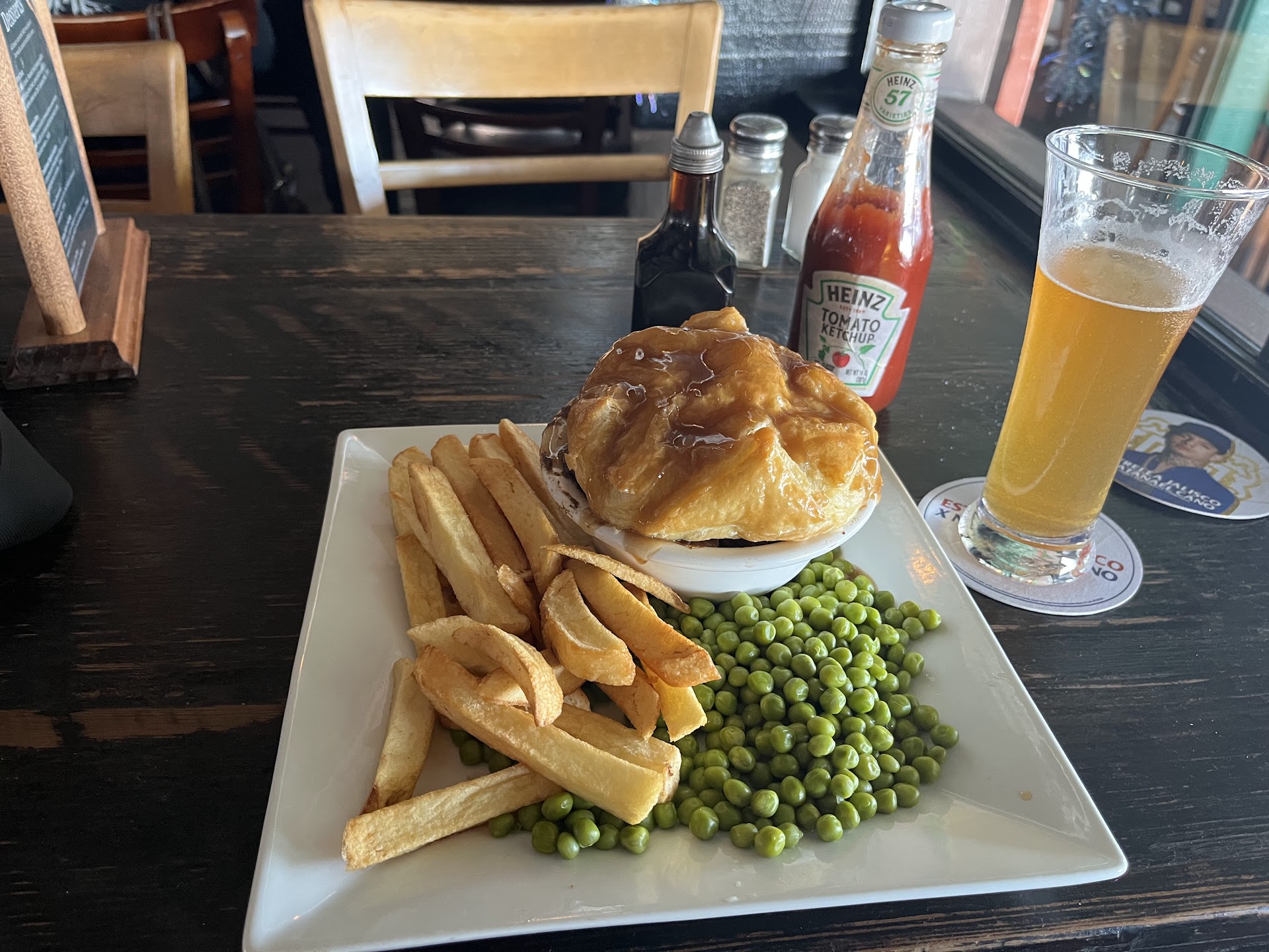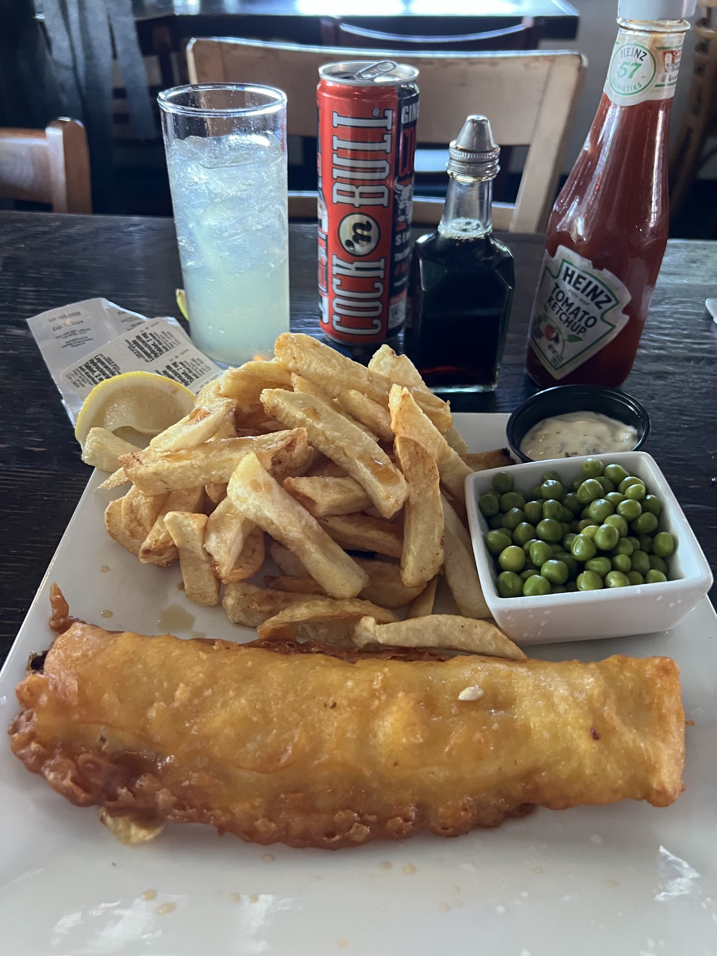 As to the food if you are British you will be satisfied. The fish and chips is standard. The chips are proper chips. Plenty of them with real malt vinegar on the table. The fish is of decent size with a perfect batter, crispy and not soggy. Peas were just right. They also offer coleslaw or American style fries for some reason.