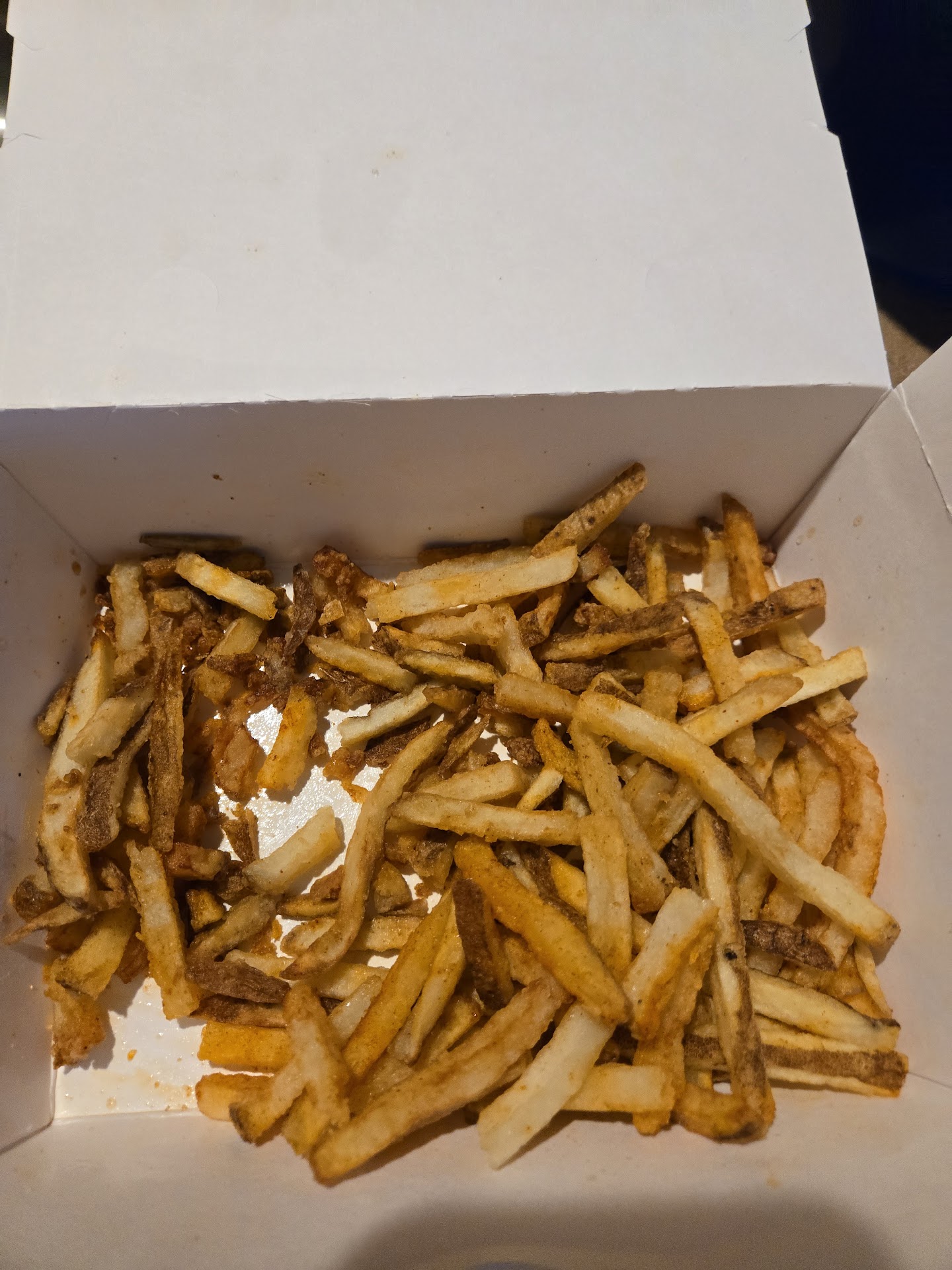 I waited over 10 minutes for the food (no problem) cost $46 gave them a few dollars tip. Got my food drove home 1 mile away and when I got home the first thing I tried were the fries. What a let down they were Limpy, cold and you could tell that they were the leftover scrapings because they had a bunch of chicken batter pieces and small burnt French fries. The rest of the food was tasty, The onion rings were hot and fresh. The sauces were just ketchup. Nothing more.