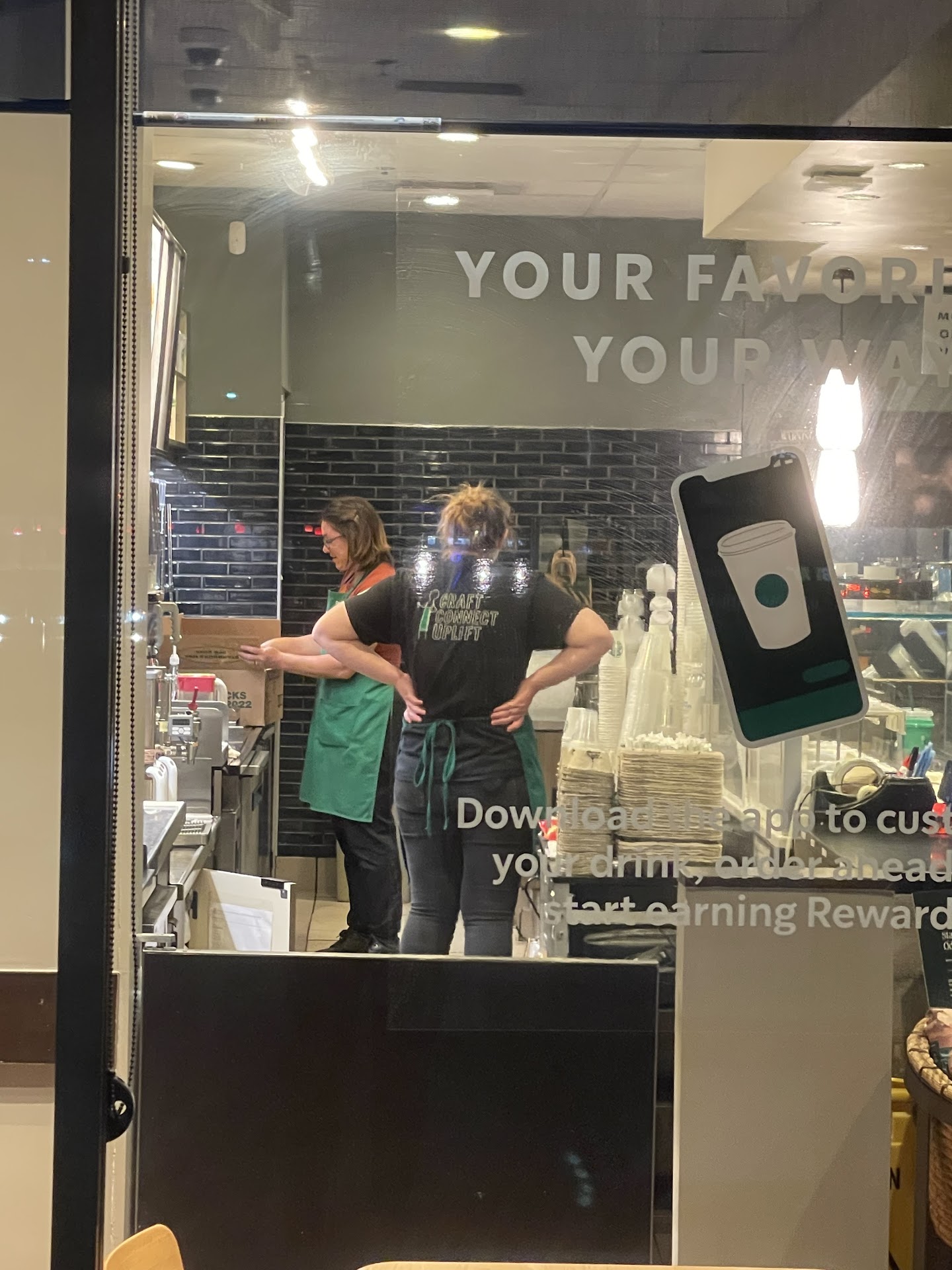 Read moreNice store, then it becomes a pain in the a$$. Try another location. Walk in get greeted, that's great. Then, give your order to the Baristas, always polite. Now, go stand in the tiny corner and wait. EVERYONE else is standing in a tiny, table crowded corner in the back, waiting for their drink to be placed on the counter, where all the other drinks in white cups are waiting, while some other customer, in very low lighting, is picking up each cup looking for his or her name. As my daughter says....Eww. ERGONOMICAL FAILURE!! Starbucks, Really?? Put the order desk in the corner. No brainer guys. Not rocket science, just common sense. Cannot believe No one at Starbucks sees this as an inconvenience?? Again...Too busy counting money to care....