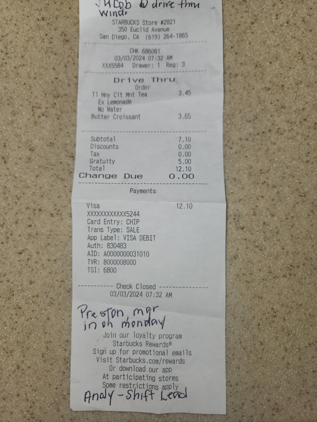 I am ABSOLUTELY DISGUSTED at how my mother was handled at this location and Iām very disheartened as a former Starbucks partner to hear what is going on in the store! They are all thieves. My mother went in at 7 AM to order a croissant and a cup of tea, which was only seven dollars, Jacob was the one on the register when he gave himself A five dollar tip on my motherās card!! My mom gave him her card to only be charged what she ordered however, after checking the receipt when she got home, she saw that he had gave himself a five dollar tip. This is outrageous to think that this store believes stealing is okay. If heās doing this to her, he is very well doing this to other people and it needs to be dealt with ASAP before you get hit with the lawsuit for theft. When someone orders something you give them the opportunity to decide on whether or not, they wish to tip you, or at least thatās how it is done at my Store. She called the store immediately after finding this out and their shift lead for the day, Andy, was Of no help And seemingly did not care that one of his baristas on the floor with stealing money, which is very alarming. That tells me that he knows of this behavior and is used to it and will not be a part of the solution to correct it. Although he is only a supervisor, you should have enough integrity to lead an honest Team. You are now part of the problem. We are waiting to speak to their manager Preston however, higher action will be taken against this store. So for those reading this, just know your money is in danger of being stolen at the store, not from a random person on the street, but from the...