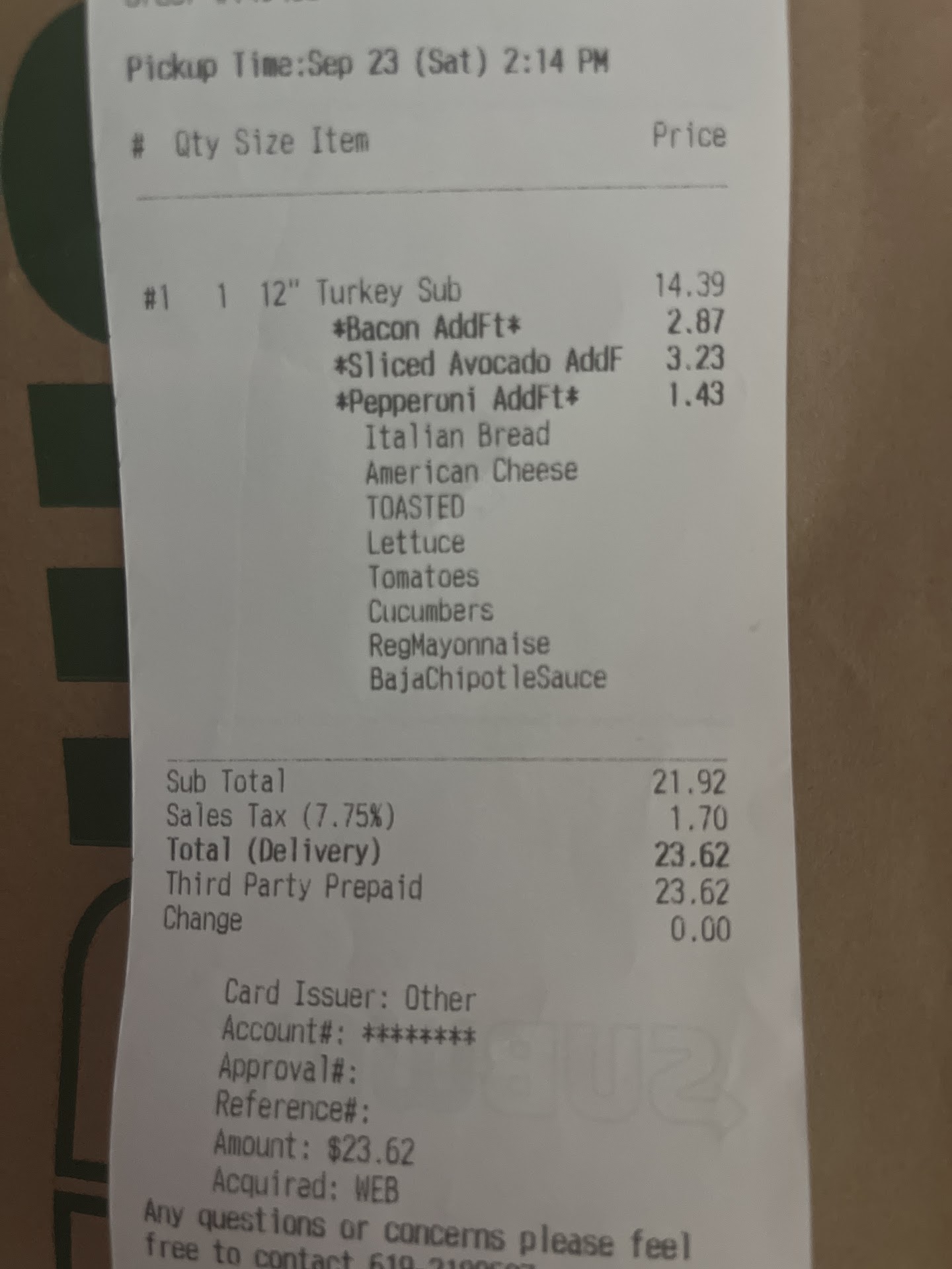 Read moreHorrible customer service! There is a lady in there that looks like she doesnât want to be there! Her attitude was very awful. She also had a negative face the whole time. This lady doesnât need to work there if she hates her life. I also had to go back in because the lady forgot to give me the second order of cookies I ordered. She looked at the receipt and thought it was a fake receipt so she looked it up on her touch screen device and she ended up being in the wrong. This lady needs to learn to be polite and respect others. You never know what someone could be going through. I will never be coming back here ever again. I hope she finds a new job! I forgot to mention that the sandwiches were not the same as I ordered them online. Very...