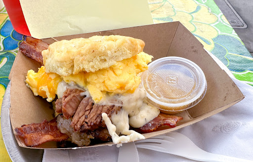 Noteworthy dishes include the Soyrizo Scramble Biscuits & Gravy, featuring a soyrizo patty, cheddar scramble, salsa verde, and country-style gravy on their signature biscuits. Another standout is The Gravy Daddy, which includes beef brisket, cheesy egg, and country-style gravy on a breakfast biscuit.