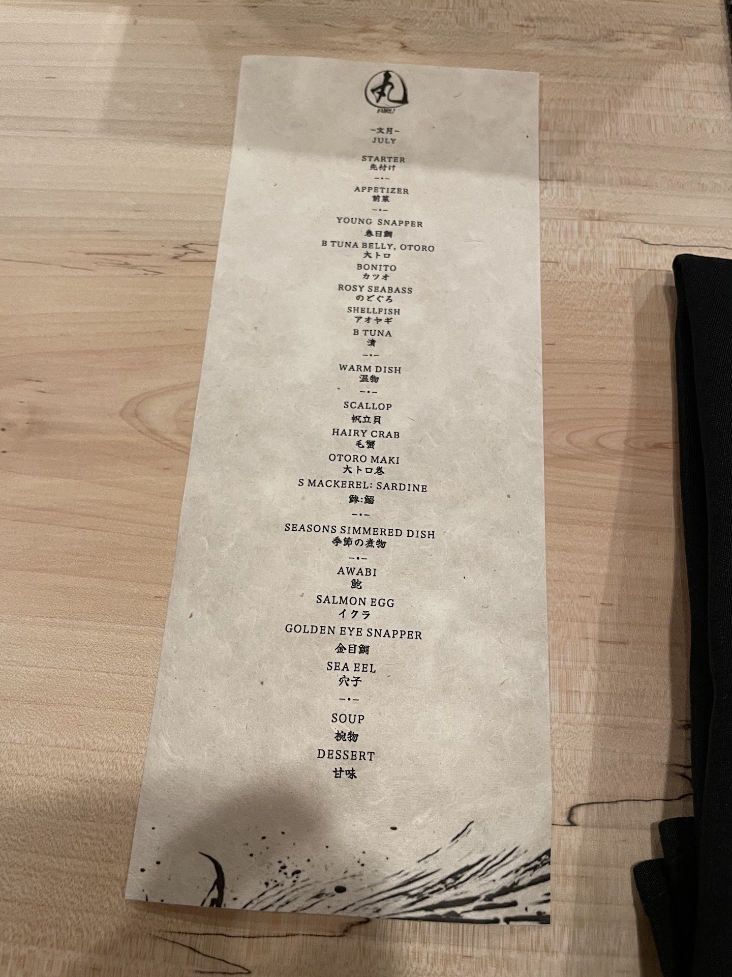 Chef Maru warmly greets us as we sit. We make small talk as more guests come in. The wait staff are absolutely professional and meticulous. Their attire clean and pressed. Shirts are so clean and sharp that I could have gotten a paper cut if I stood too close. We are offered the drink menu and the staff suggest that everything goes well with tonight’s menu