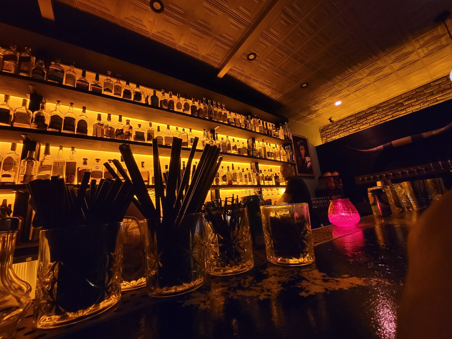The ambiance of the place was probably my favorite. I read that the owner was trying to go for Steakhouse vibes without the steak, and he definitely hit the mark. The bar area is open and welcoming with dimly lit booths to settle into. A lot of craftsmanship and love went into the patio area, evident by the detail in the wood siding and mood lighting.