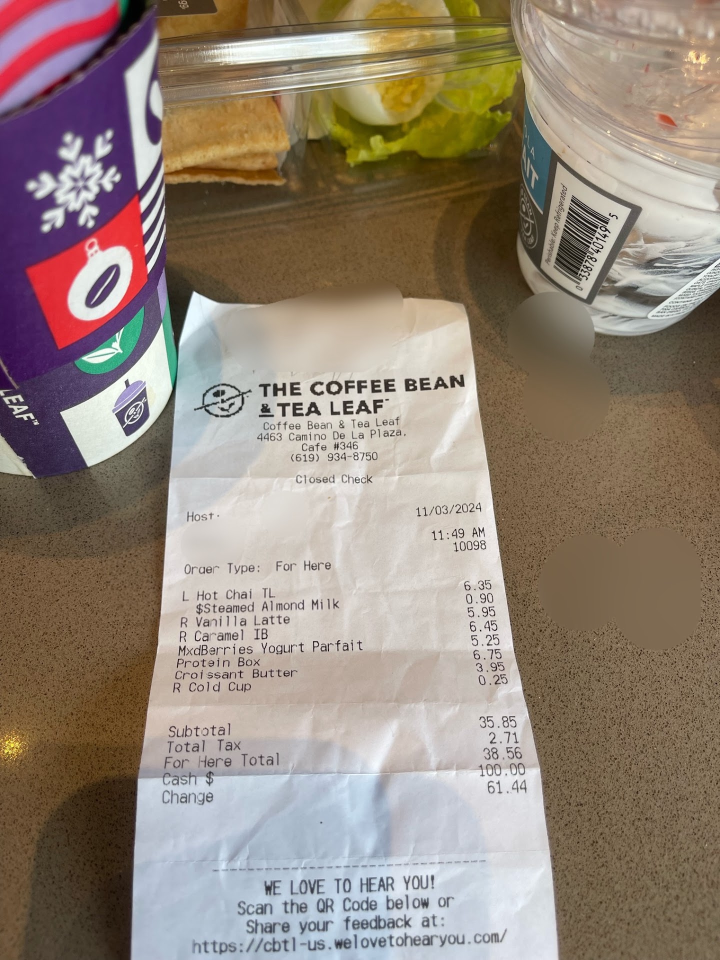 Every time we go to Las Americas Outlet, our first stop is always The Coffee Bean and Tea Leaf. Weâve never had a bad experienceâuntil now. The drinks have always been great, so this time we ordered a few more than usual. As we walked off, I even said how consistently amazing everything has been.