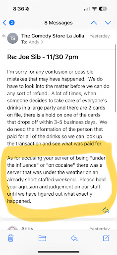 We were guests on Sunday (April 14, 2024) and were told we could not enter the comedy club with a backpack. This would have been fine, if we had known of this policy beforehand. We were told upon our arrival that backpacks were not allowed AND that the information was posted on the website (by the bouncer at the front, who was extremely rude to us). This was news to us since we searched the website for this information several weeks before we arrived. I have searched the website today, and cannot find the information at all. This “no backpack or luggage policy” does not exist online at all - it is not on your website and it is not posted on tickets purchased for shows. We did not drive to the venue, so we could not easily stash the bag in a vehicle, and were not offered any accommodations or alternatives for where to place the backpack, besides outside with no supervision from anyone. They told us it was our fault for not having a secure location to place a bag - even after telling them we arrived via public transportation. We did not have a location to place our bags and the club refused to hold the backpack for us, since they have had issues with “luggage” in the past, and we also volunteered the security to search through the bag. In my experience, when a business does not have a policy posted publicly, then they have accommodated guests that do not know local policies. While local guests may know this, how are out of town guests supposed to know this rule? I would understand if the show was sold out and there was very limited space. This was not the case. The club was maybe at 40% capacity (this is generous), so it wasn’t like they were crunched for space (for a BACKPACK). Staff was extremely rude and blamed us for not being aware of an internal policy that they do not post about. This is ridiculous. Please let the club know they should publicly post policies that turn people away from the door, even after we have paid for the show that night in advance. Unacceptable way to treat out of town guests. Please do better. I will not recommend this location to my friends or anyone visiting San Diego after this...