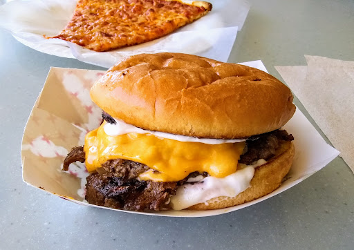Came here tonight for the very first time and I have to honestly say I WAS NOT impressed at all. First of alI you go in, the place is a dump. It feels very dirty. No ambiance. They have 2 trash cans completely overflowing with trash and pizza boxes and they don't even empty out the trash cans for their guests. Not acceptable. Now to the food, I ordered their "famous cheeseburger" EXACTLY HOW they "recommend/enforce" you eat it and when I received the burger, it looked liked someone sat on it after being left in their back pants pocket. Didn't have good presentation. So, when I first started to eat it, all I could honestly taste was grease!! It reminded me of eating a Sonic burger. Which I haven't had in over 10 years because I hate Sonic burger. It WAS NOT GOOD at all. Jack in the box is better!! The burger was so greasy I couldn't even taste the meat. I almost threw it away because that is how bad it was. After eating it, I felt like my arteries were instantly clogged!! The buns were also terrible. Very industrial tasting. I feel like they just bought the buns at Vons. There was NOTHING SPECIAL about it. Very plain. Tasted like wonder bread buns. As far as the pizza here, I had a slice of the veggie and it wasn't bad. That is why I am rating them 3 stars. If I was just rating the burger it would ONLY be a 1 star easily. But the pizza was much better. But Luigi's has much better pizza if you are in North Park and the prices for the slices is about the same. If you want a good burger in North Park, I would recommend "Crazee Burger." They are 100 times BETTER than this place. Honestly. I truly thought it would be much better after seeing how highly they were rated on Yelp. But I must say, this place was a HUGE disappointment...