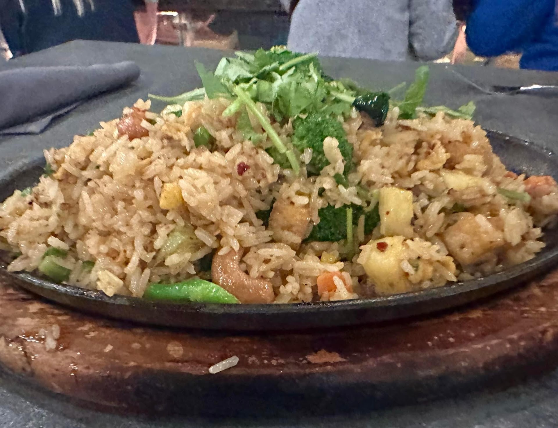 This Veggie Fried Rice had Satay sauce, tofu, Chinese broccoli, pineapple, onion, carrot, peas, scallions, egg, cashews and Thai basil. Itās an absolute winner! This will definitely be added to my, āI donāt feel like cooking at home but will just call in a local order to goā meal. Though the hot skillet plate it is served on is also part of the charm. Everything on the plate stays hot with every bite for at least 15-20 minutes.