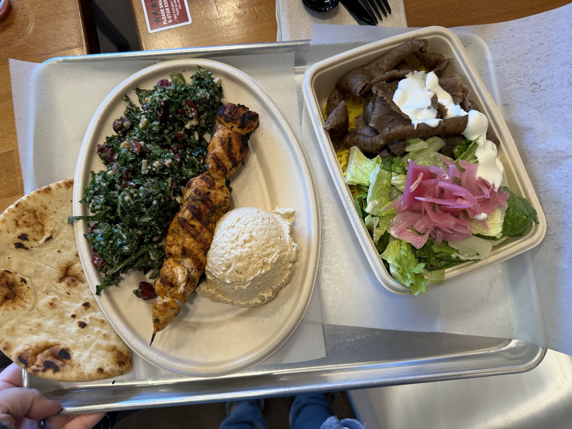 Read moreGood food, noisy atmosphere. I've eaten twice at the Mission Valley location, both times very satisfied with food and the service of the staff. They have always been smiling and friendly. They maintain the cleanliness of dining area when ever and restrooms efficiently. I enjoy the plate with two sides, (usually choosing two salads). My friend got the chicken from the skewer (schwarma) and I got the lamb and beef. We shared a side of the falafels. The order of falafels is large enough for a meal on its own, so there was plenty to share. I only gave four stars because of the noise level. Cement floors, and corrugated steel wall coverings amplify the voices and the kitchen noise, encouraging people to speak even louder to be heard by the person sitting opposite them, sharing their conversation with anyone nearby. Most of the tables are large (with six chairs) sometimes occupied by only two diners, so seating is limited. The outdoor seating is my preferred place to sit but the area is not as well maintained since it is a shared space. They do participate in food delivery apps such as Grub Hub. (I'm not affiliated with any of them.) I will...