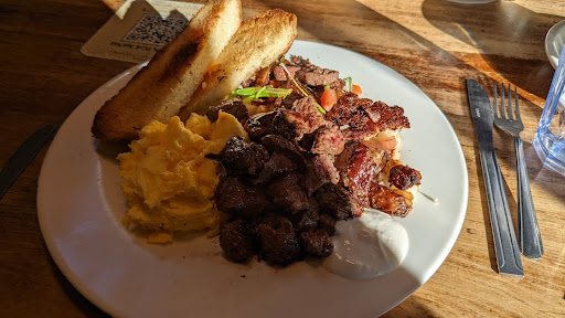 This place had one of those rare menus were every single dish sounded like an absolute banger. I had to resort to asking the server for help. And my suspicions were confirmed. I ordered the Steak & Eggs (Grilled CAB Steak + horseradish cream + rosemary potatoes + grilled rosemary bread + scrambled eggs).